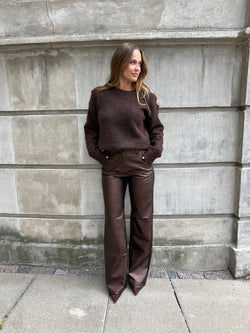 Beskrivelse: Trendy og stilfulde PU bukser i en shiny skøn choko brun farve. Bukserne har et moderne look med en let glans, der tilføjer kant og elegance til dit outfit. Den komfortable pasform gør dem perfekte til både hverdag og festlige anledninger. Højtaljede, lige ben