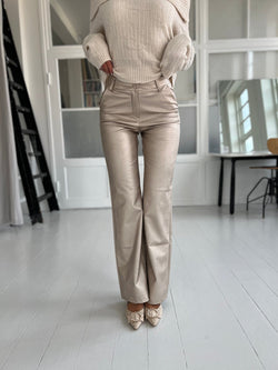 Beskrivelse: Trendy og stilfulde PU bukser i en skinnende metallic champagnefarve. Bukserne har et moderne look med en let glans, der tilføjer kant og elegance til dit outfit. Den komfortable pasform gør dem perfekte til både hverdag og festlige anledninger.