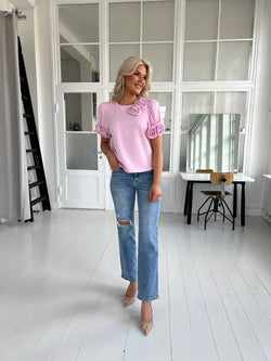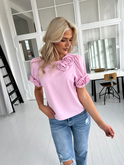 Beskrivelse: Denne lyserøde bluse har et feminint og elegant look med pufærmer og dekorative stofroser på skulder og ærmer. Dens skulderpuder og bløde kvalitet gør den både stilfuld og behagelig – perfekt til både hverdag og fest.