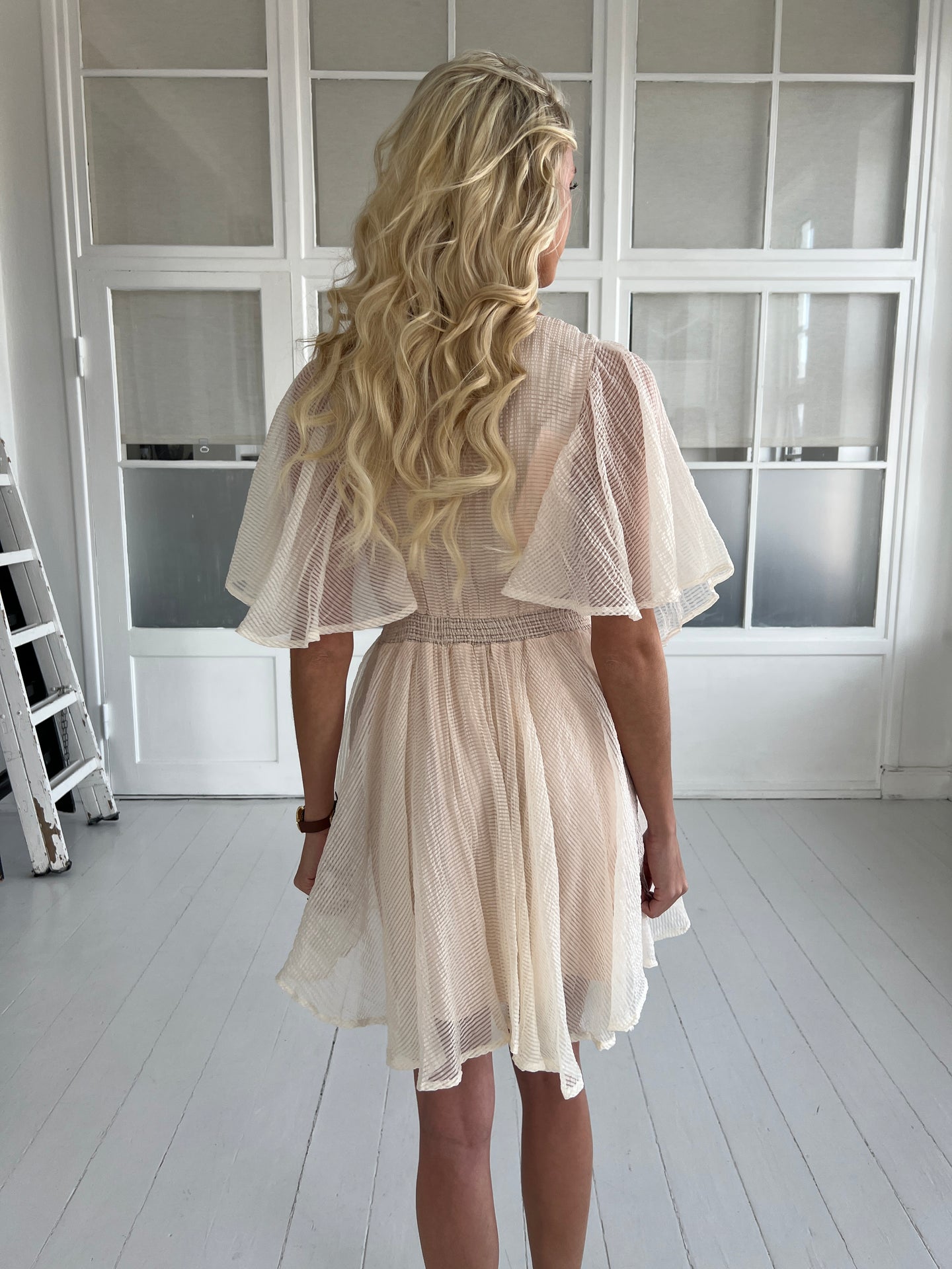 Beskrivelse: Virkelig fin og florlet kjole med korte flagermusærmer som er simitransparent , elastik i livet, knapper ved bryst , underkjole, v-udskæring