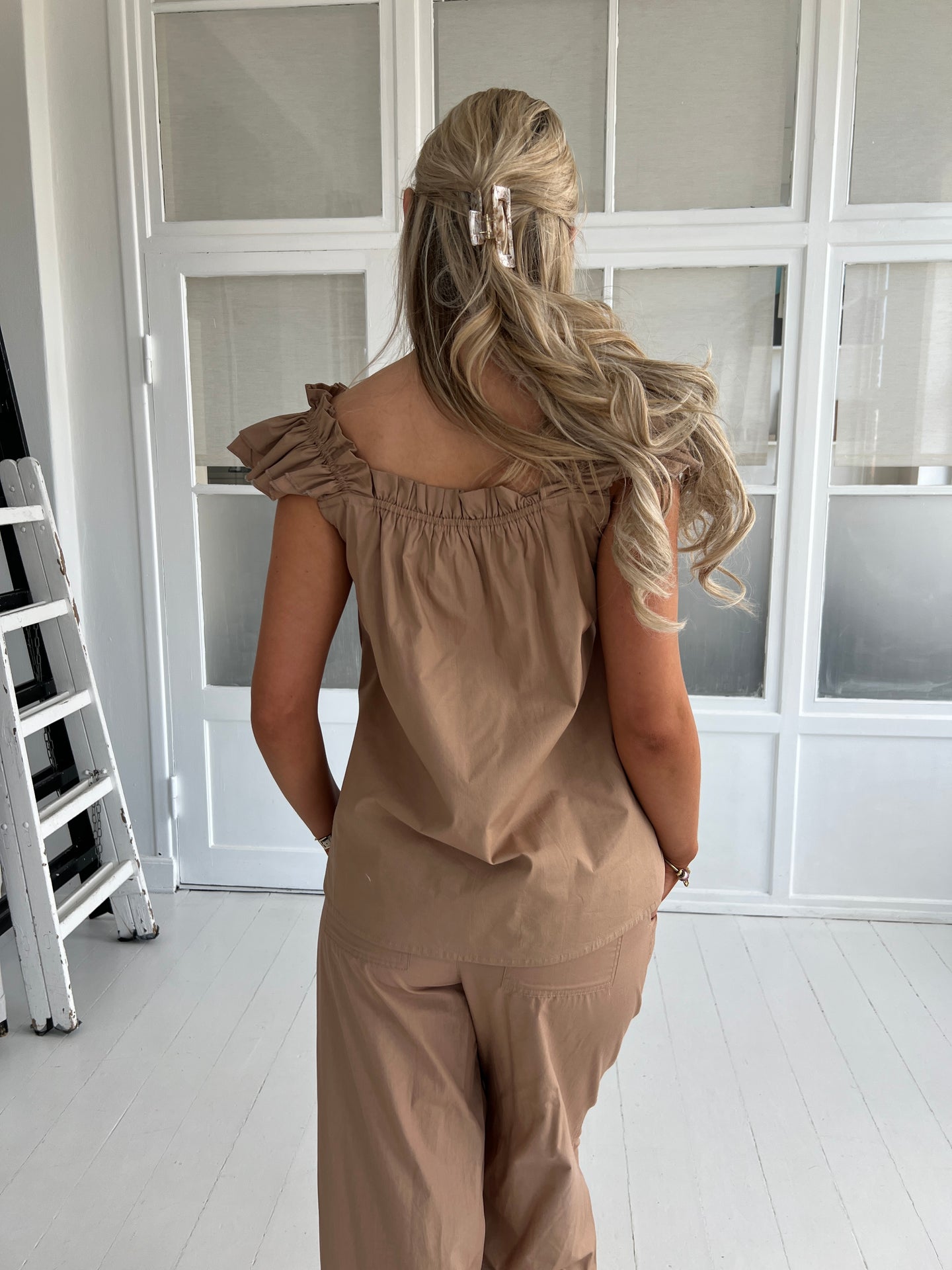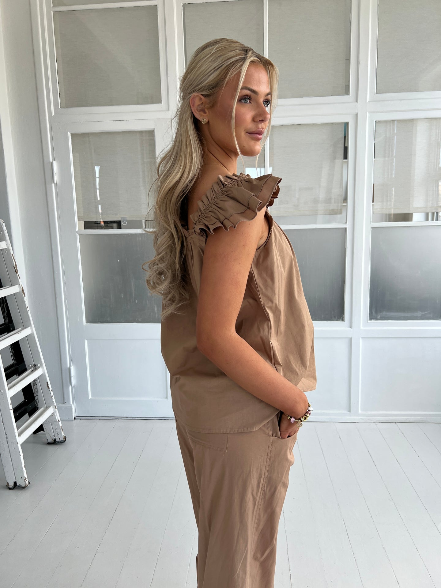 Beskrivelse: Let a-skåret med firkantet halsudskæring, brede skuldre og stropper med flæsedetaljer i bomuld.
