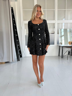 Super smuk og feminin sort pailette kjole med virkelig smuk udskæring mange smukke detaljer som blomster knapper med perler og similisten. A-facon i skørtet, Underkjole