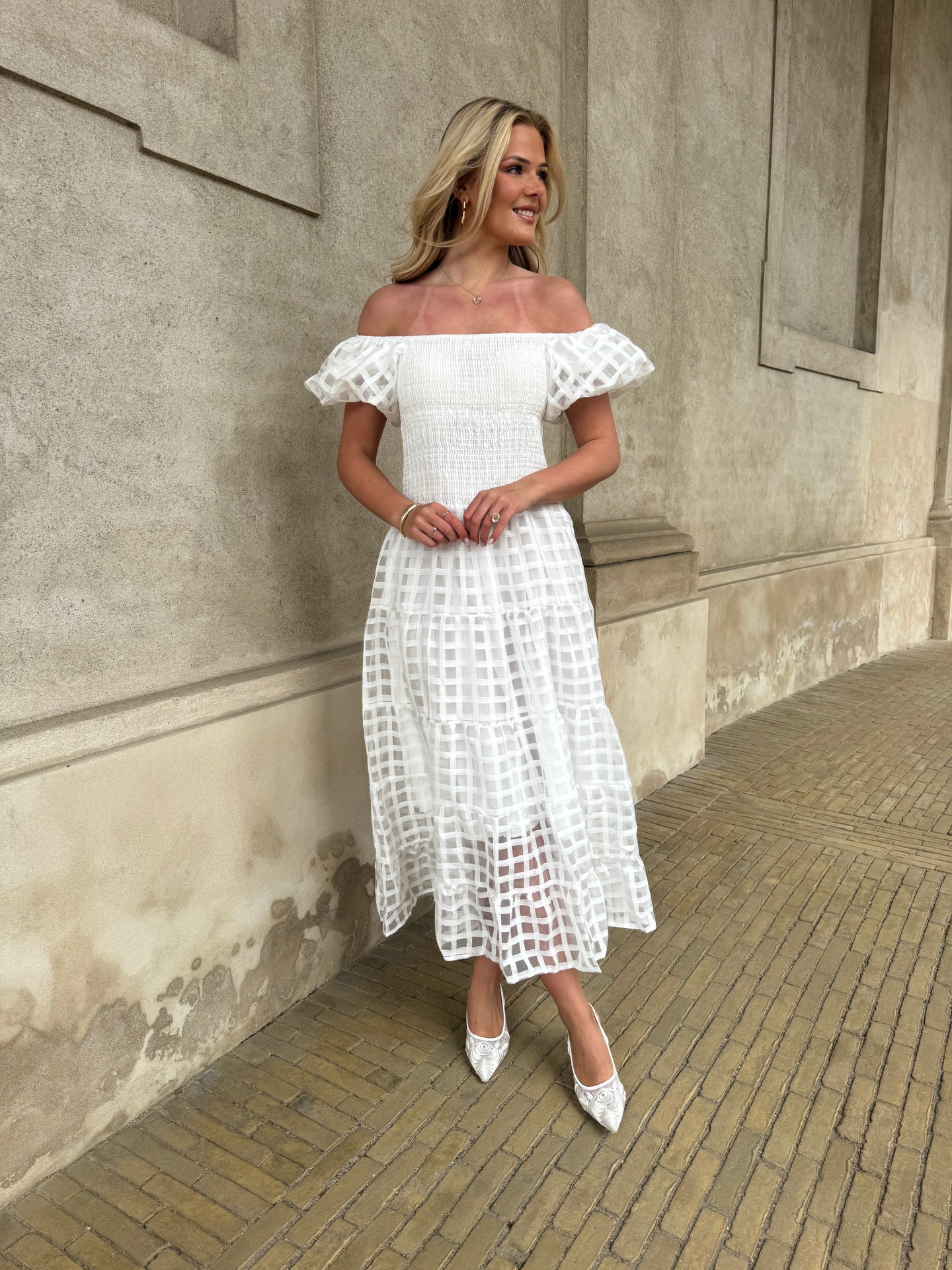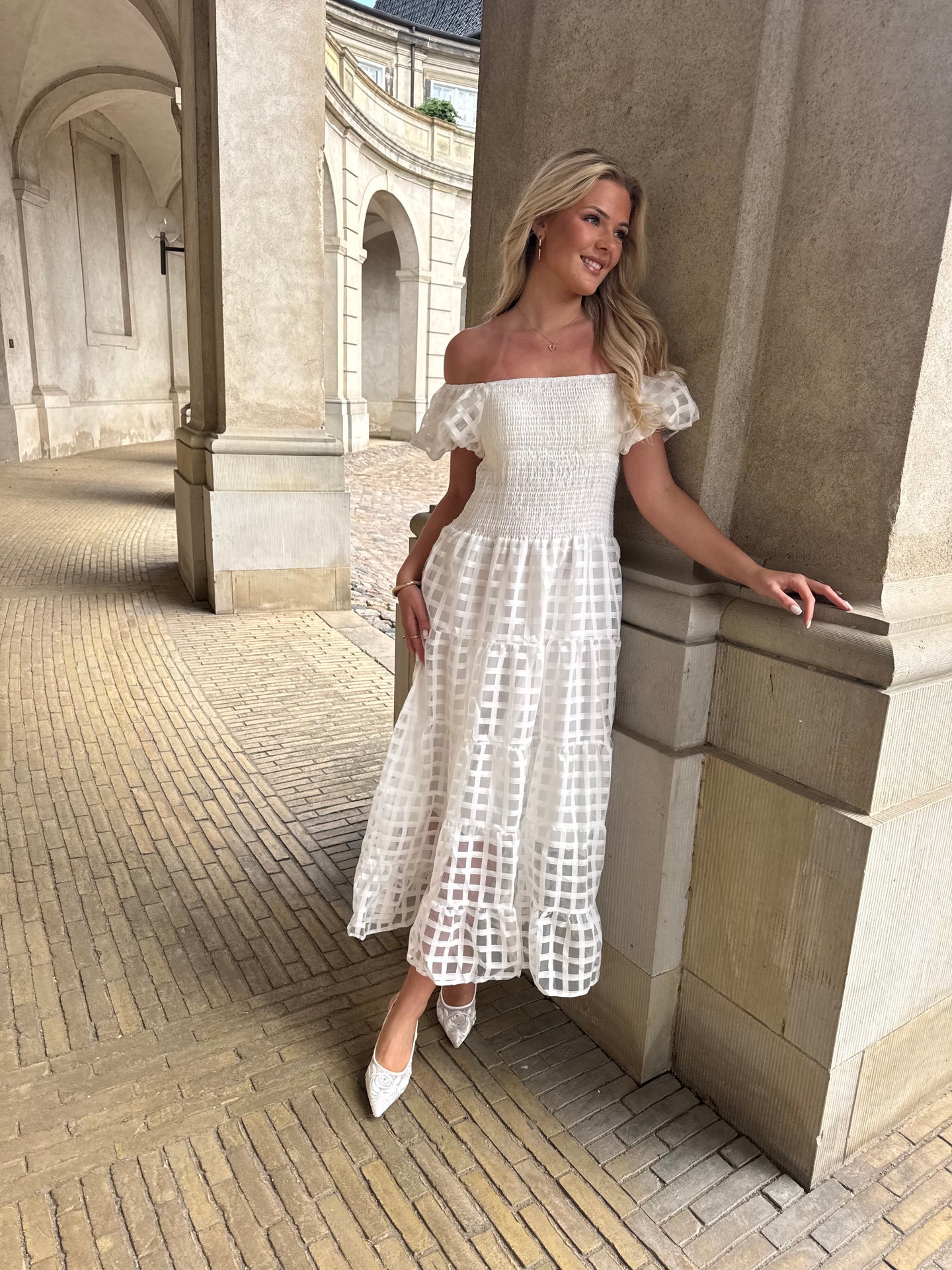 Meget smuk og feminin kjole med scrunch og korte pufærmer, underkjole. Ikke gennemsigtig.