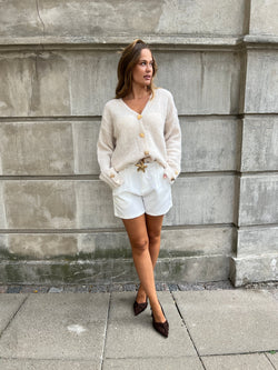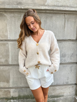 Blød og feminin strik cardigan med v-udskæring og smukke gyldne knapper ned foran samt på ærmerne Efterårets og vinterens musthave farve
