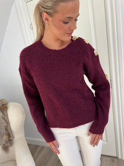 Blød og feminin strik med rund-udskæring og smukke gyldne knapper på skulder. Efterårets og vinterens musthave farve