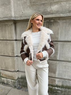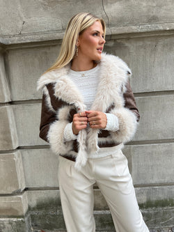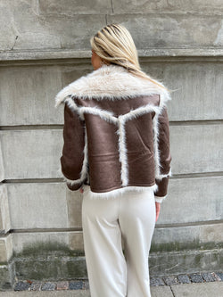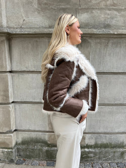 Mega fin mørkebrun jakke med hvid fake fur, lommer, man kan vende pelsen ud af nederst på ærmerne. Meget anvendelig. Normal i str.