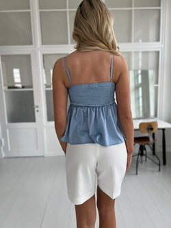 Elegant støvet blå top med finde detaljer, med V udskæring med sten langs. Toppen har justerbare stroppe og smock på ryggen. Onesize, passer str. 36-40.