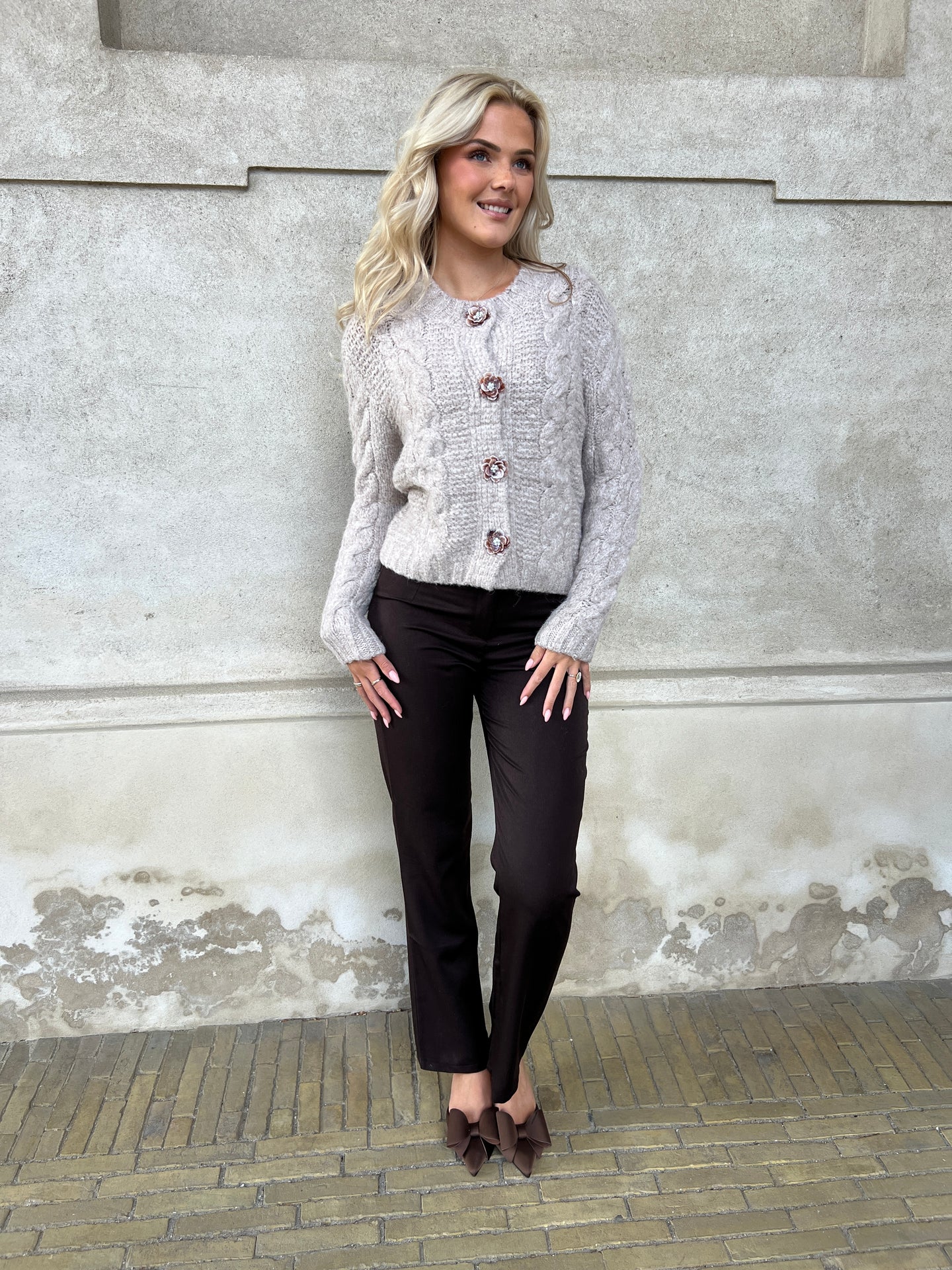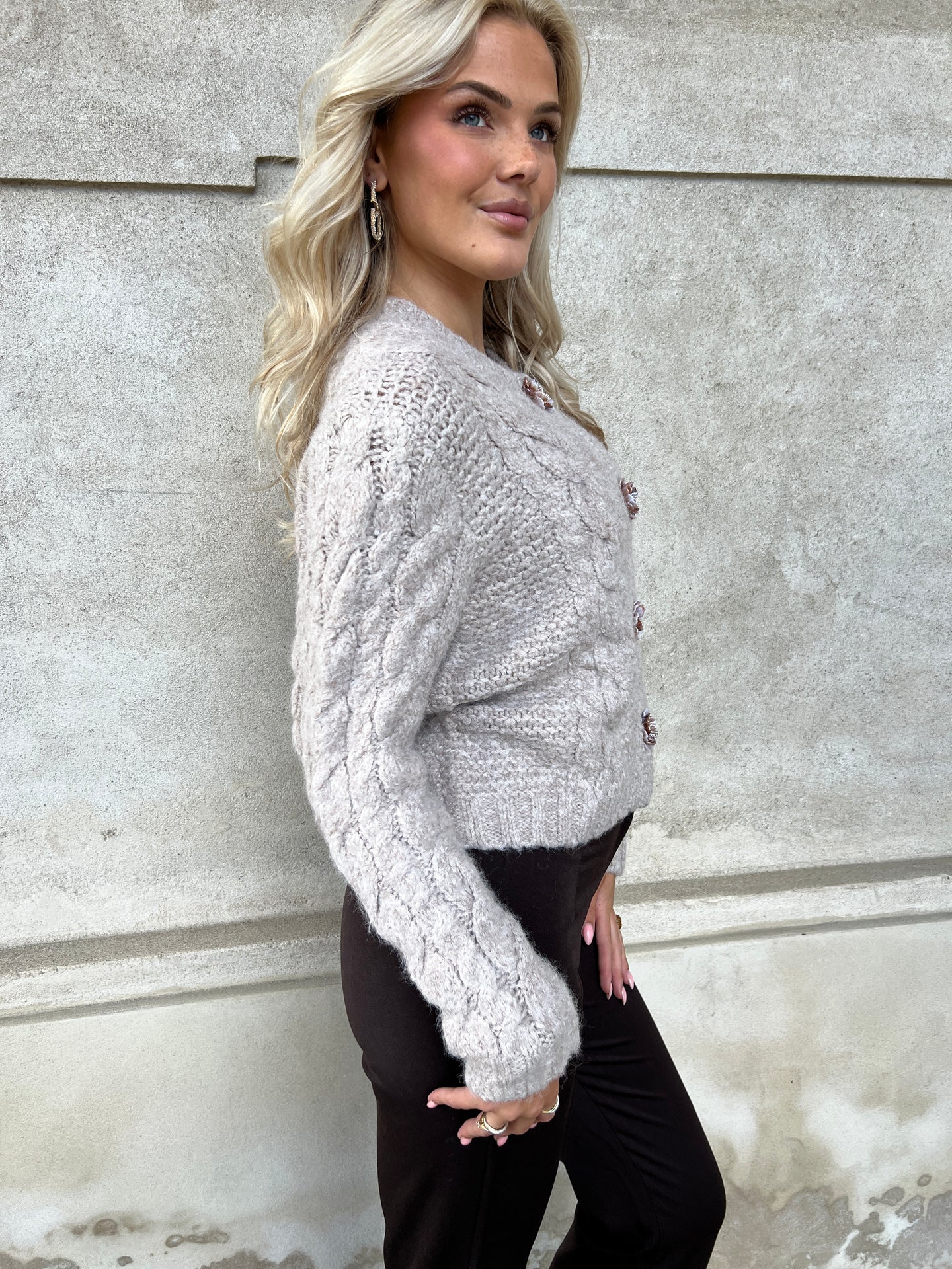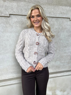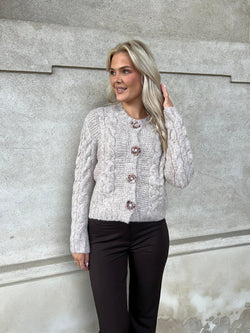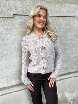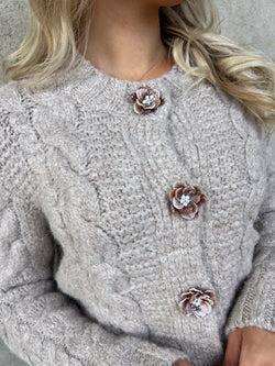 Blød og feminin strik cardigan med rund-udskæring og smukke perlemors knapper formet som blomst ned foran.. Efterårets og vinterens musthave farve