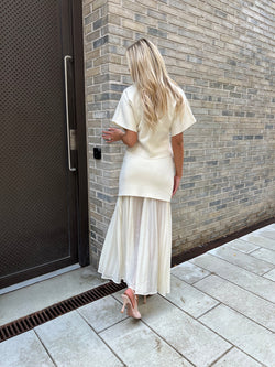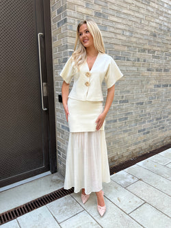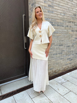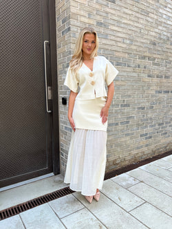 Sættet består af en cardigan/bluse med v-udskæring, smukke gyldne knapper og fine detaljer. Lang nederdel med elastik i livet, super trendy nederdel delt i 2 forskellige kvaliteter. Der er stræk i sættet