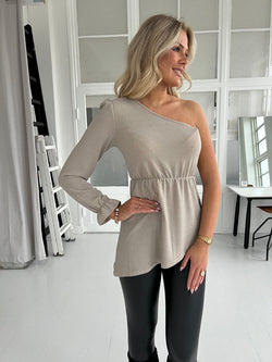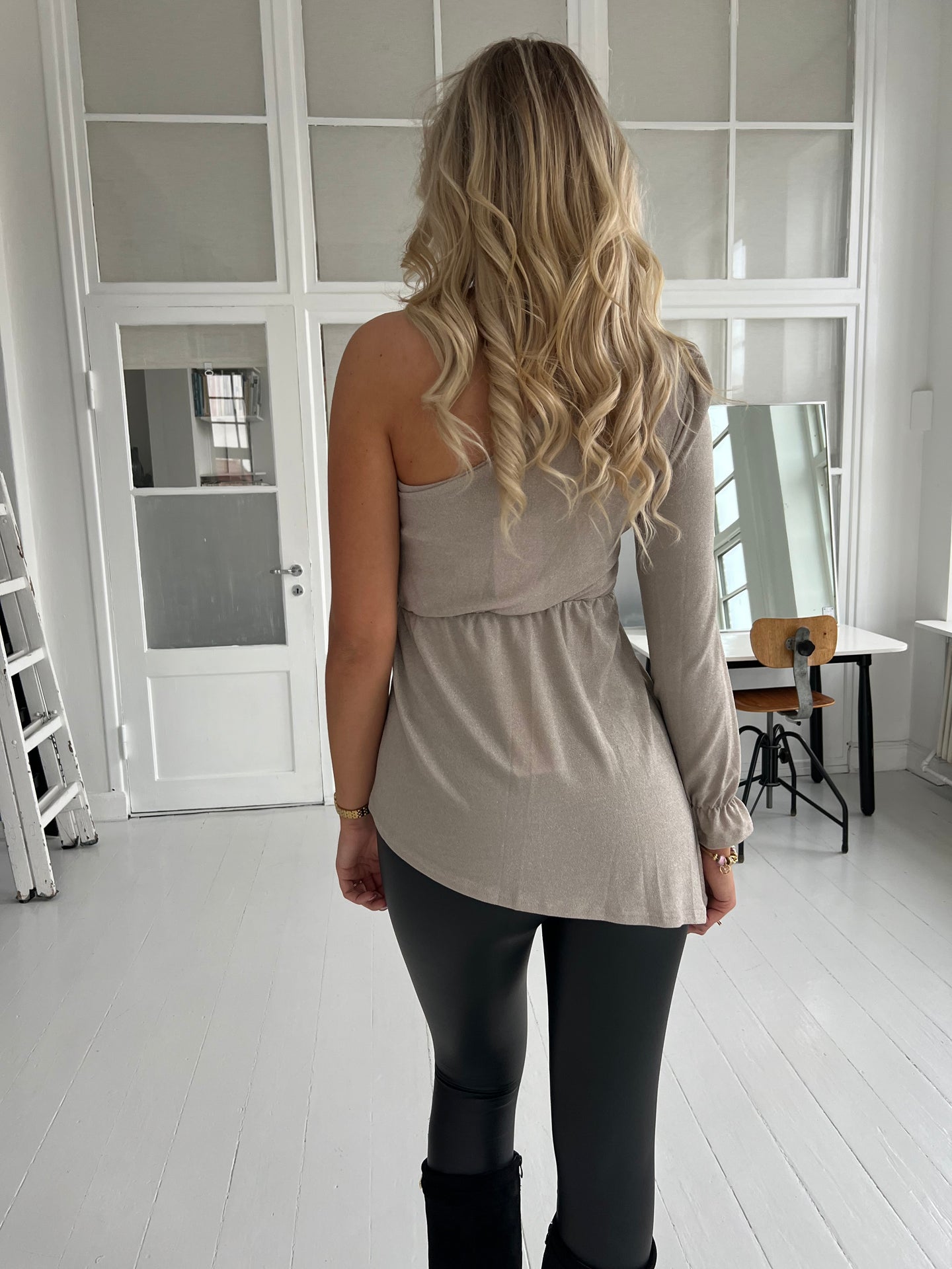 Denne beige one-shoulder bluse  med glitter er en fantastisk tilføjelse til din garderobe. Blusen kombinerer elegance med et moderne design og har en enkelt skulder, der skaber en smuk, asymmetrisk silhuet. Det glitrende materiale fanger lyset på en fortryllende måde, hvilket giver et glamourøst og iøjnefaldende udtryk, perfekt til festlige anledninger.