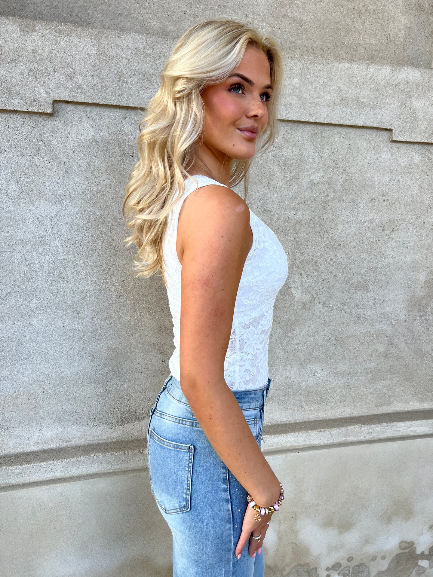 Elegant og stilfuld beige blonde bodystocking, med flatterende V-udskæring med blondekant og en tætsiddende pasform. lukkes forneden.
