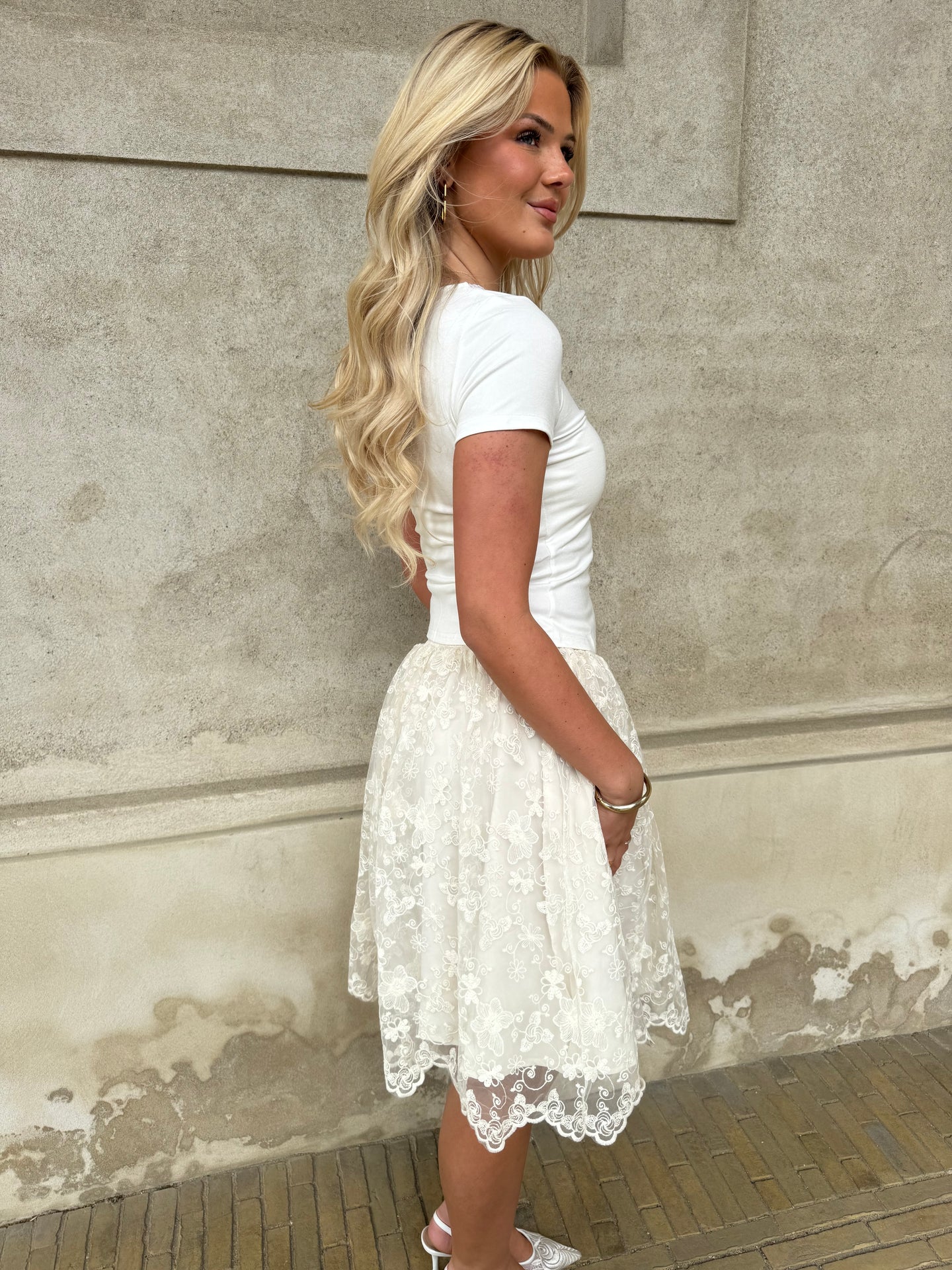 Virkelig sød og romantisk bluse i en virkelig lækker blød bomulds kvalitet med v-udskæring hvor der er blondekant som også løber ned foran på blusen. Korte ærmer. Masser af stretch
