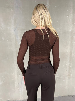 Virkelig smuk brun mesh bluse, tætsiddende, rund hals og masser af små sten over hele blusen. gennemsigtig. Lange ærmer