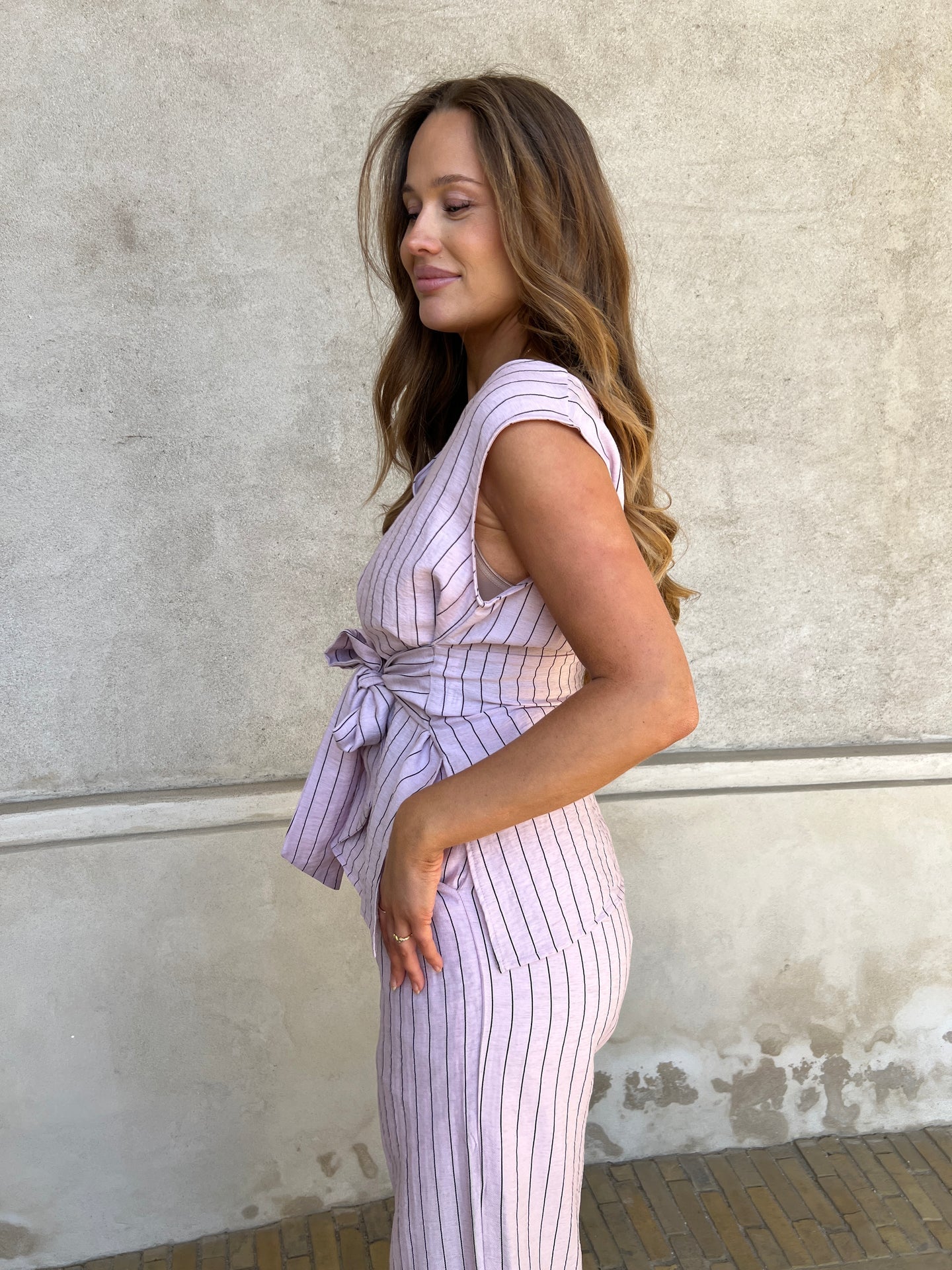 Beskrivelse: Denne flotte stribede top har en dyb v-hals og det smukkeste bindebånd, som enten kan bindes på ryggen eller foran. Der er slidser i hver side samt dyb ryg. I toppen er der syet understof på forsiden så den ikke er gennemsigtig.