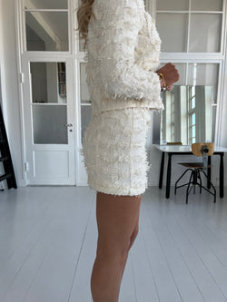 Beskrivelse: Denne elegante beige bouclé-nederdel har en fin, tekstureret finish med dekorative frynser og to lommer foran med smukke knapper. Den har en skræddersyet pasform og giver et sofistikeret look. lynes i siden. Perfekte sammen med den matchende vest.