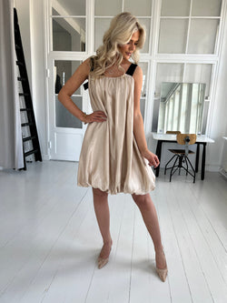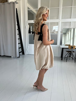 Beskrivelse: Denne kjole har et unikt design med brede, sorte stropper, med sløjfer som kan vendes både foran og bagpå, så du kan tilpasse looket. Kjolen har en luftig pasform og et let skinnende stof, der giver et elegant udtryk. Den ballonformede kjole skaber et smukt fald, perfekt til både hverdag og fest.