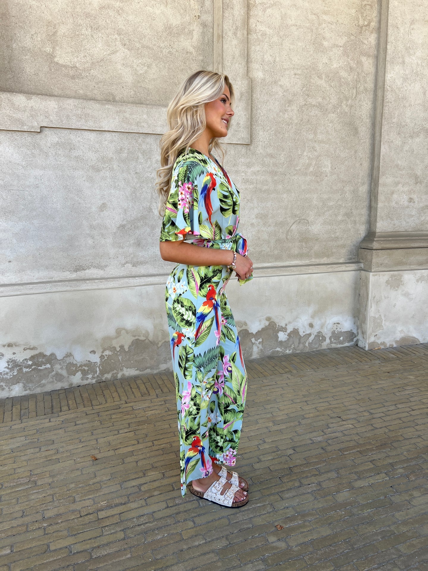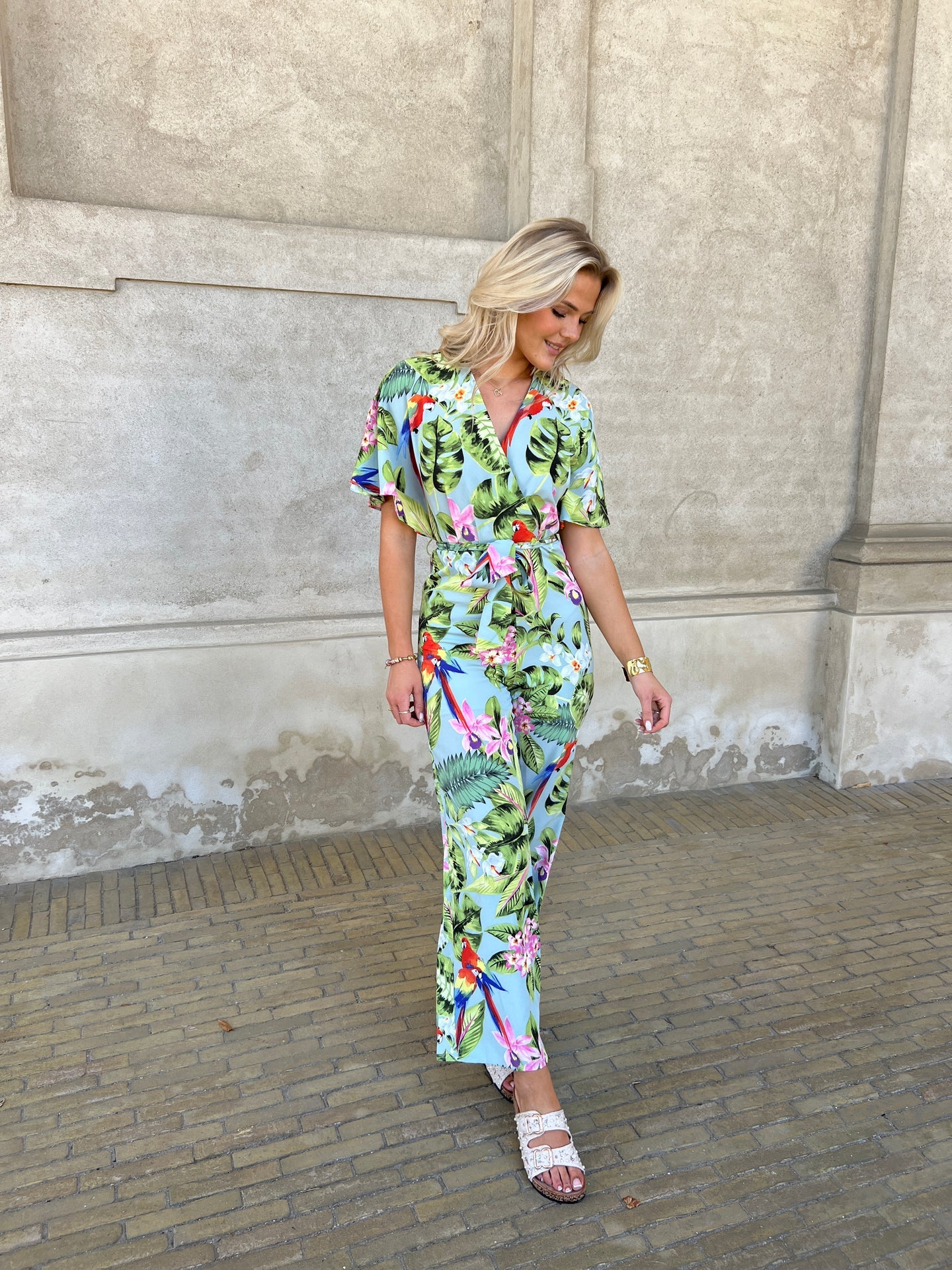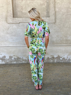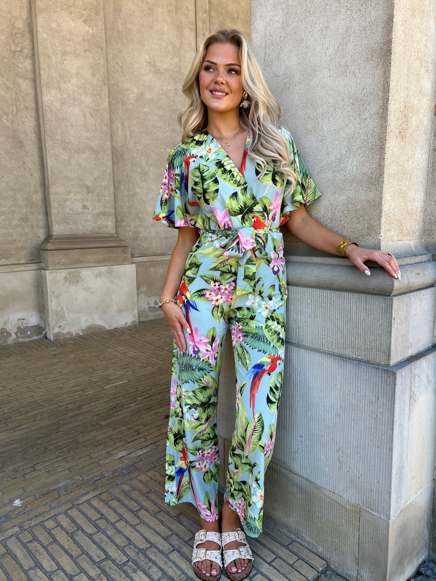Virkelig lækker buksedragt. Den har en smuk V-udskæring, bindebånd i taljen samt elastik i taljen. Den har en flatterende og behagelig pasform. Meget smukt print