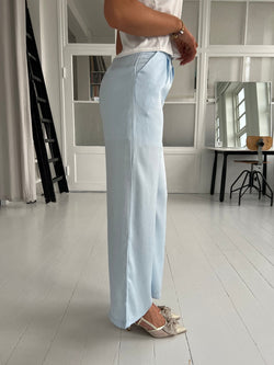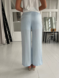 Beskrivelse: Lækre tyrkis farvet satin bukser som lukkes med knap og lynlås. Højtaljeret og lige ben.