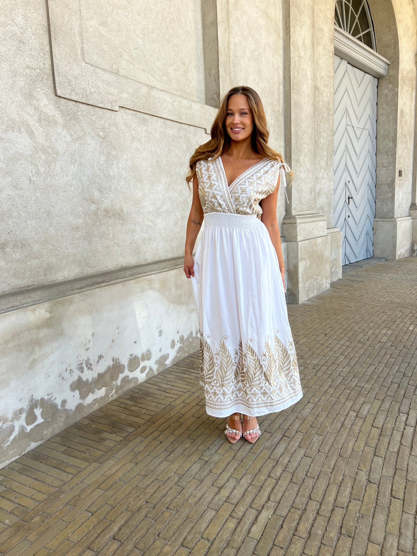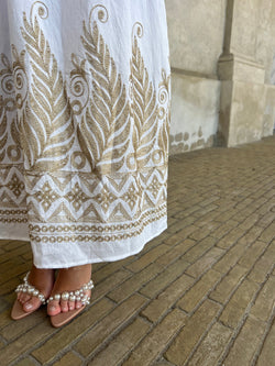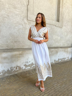 Beskrivelse:Let og sommerlig kjole med dyb V-udskæring og smukke brune broderier på overdelen. Elastisk talje giver en flatterende pasform, og det luftige skørt har matchend