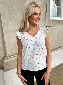 Meget fin lille top/bluse med v-udskæring og flæser på skuldrene. Lille gylden kant i udskæringen.