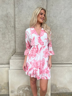 Sød og sommerlig kjole med fint blomster print. Skørtet er i 2 lag, med flæser forneden. V-udskæring og flæse ærmer 3/4. Elastik i taljen. Falder meget smukt. God pasform. Normal i str.