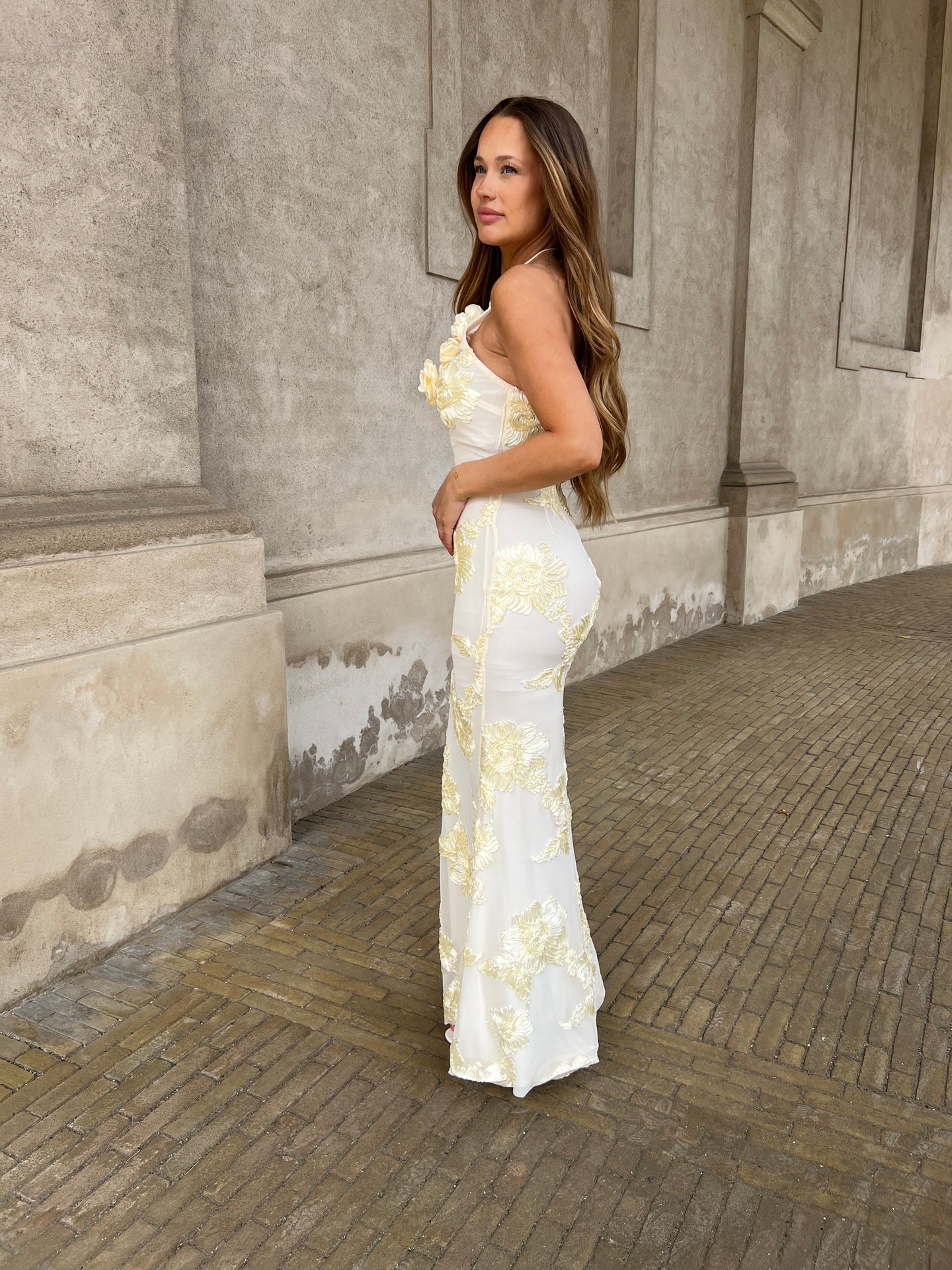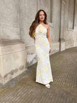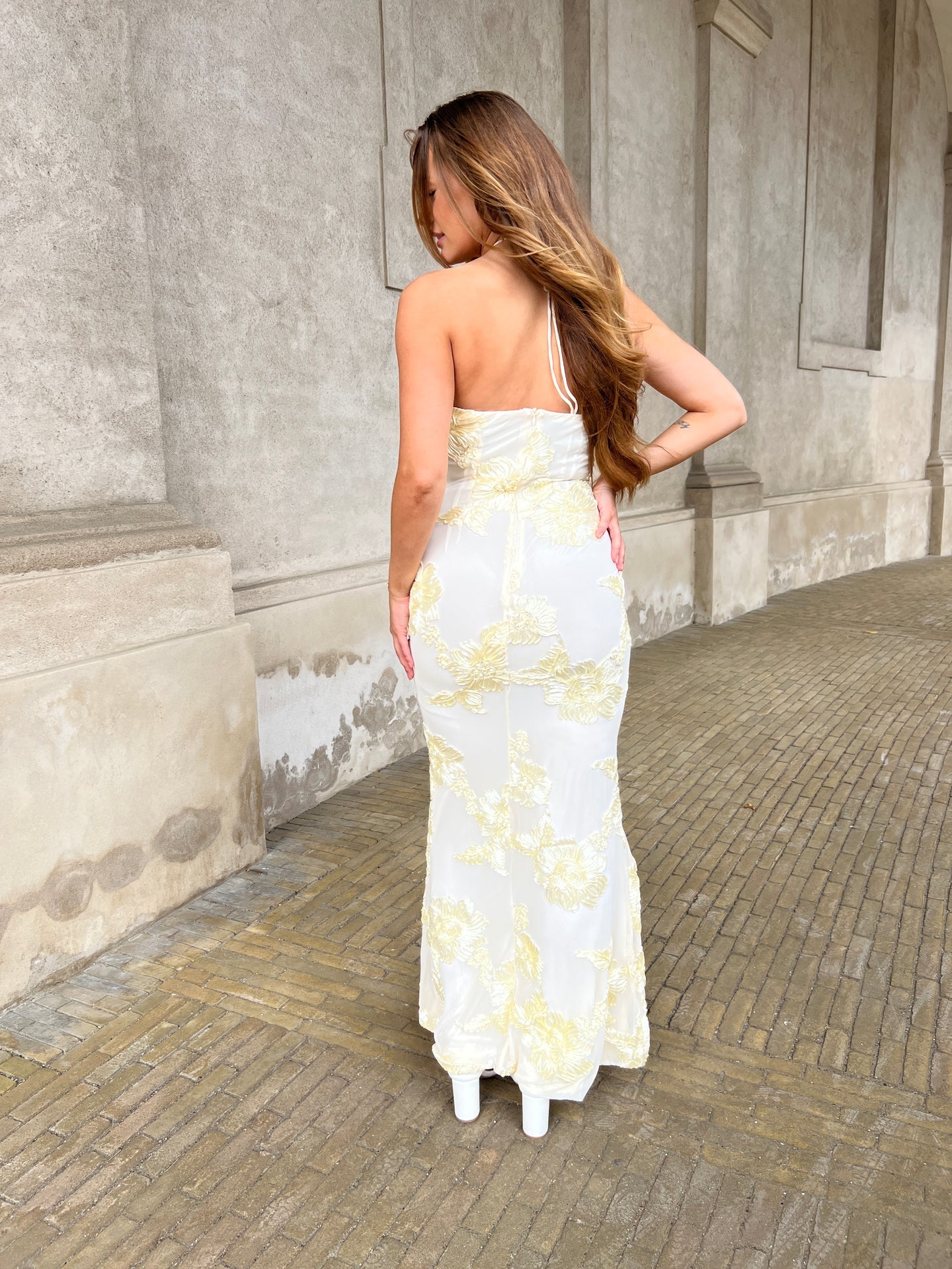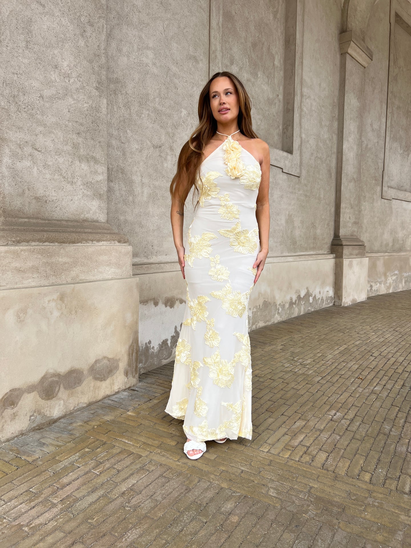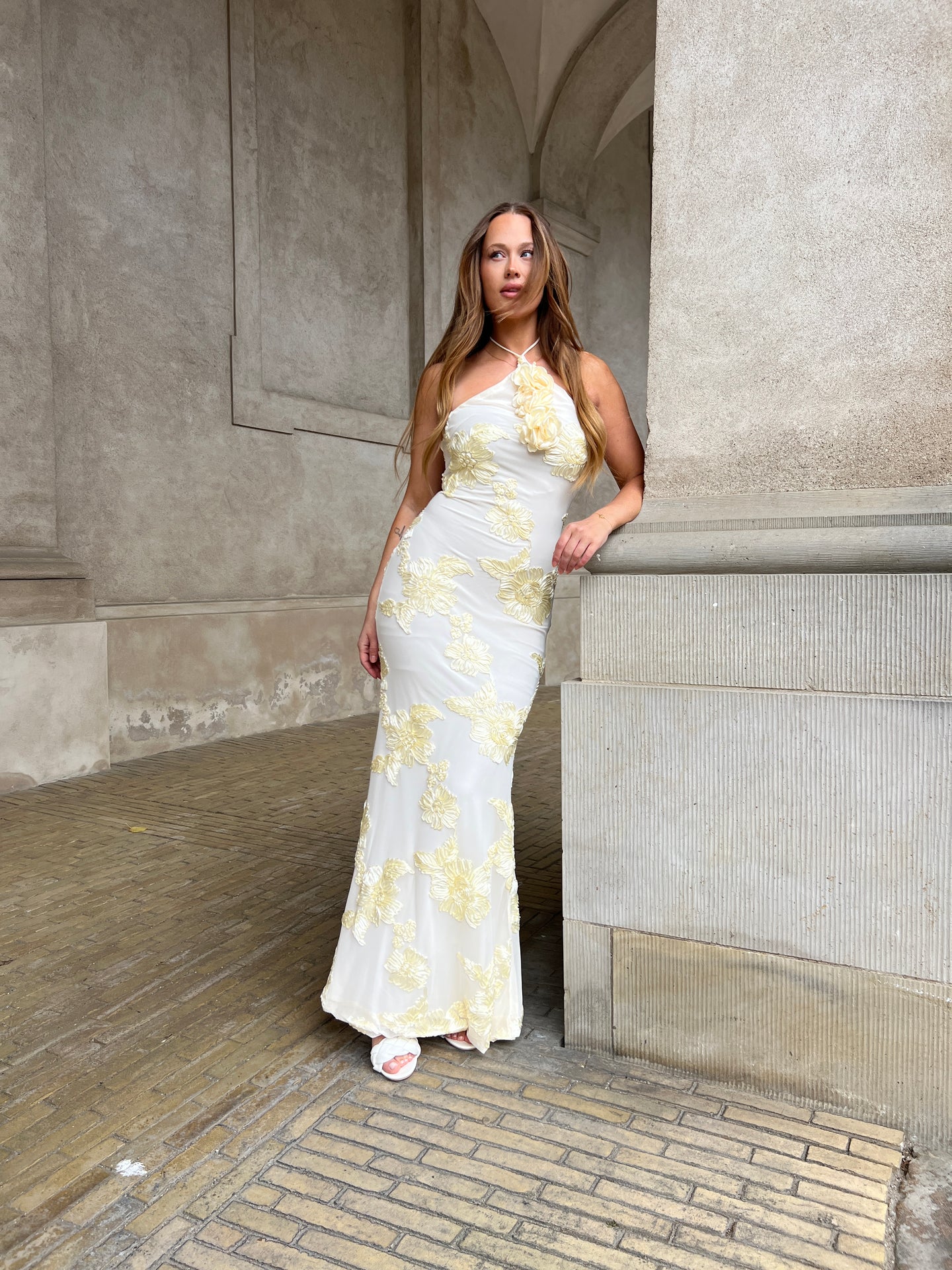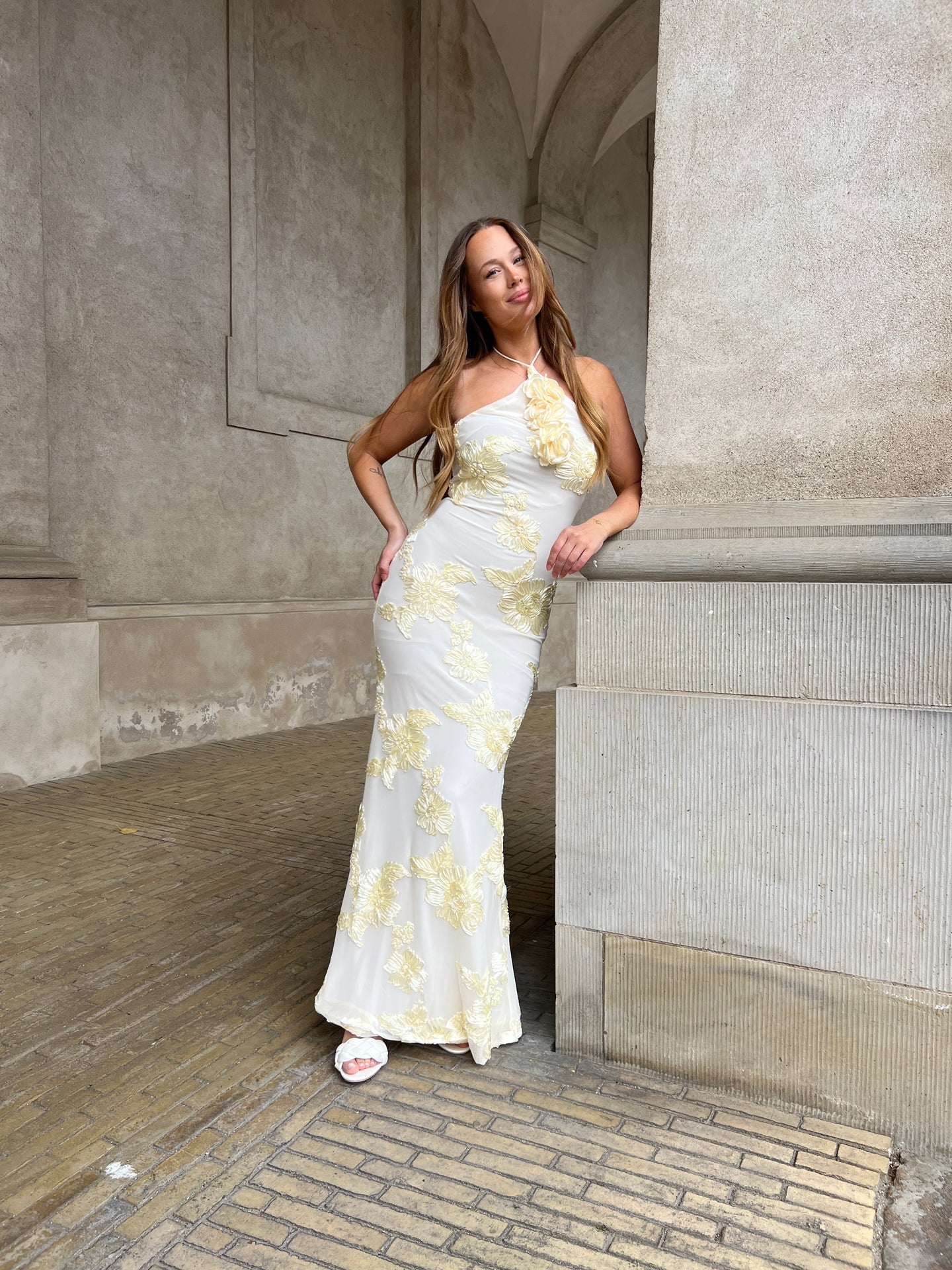Beskrivelse: Virkelig smuk lang beige stram kjole, med meget feminine blomster og detaljer, bindes i nakken, lynes på lænden. Underkjole. . Blød og behagelig at have på. Åben ryg. Helt fantastisk smuk kjole.
