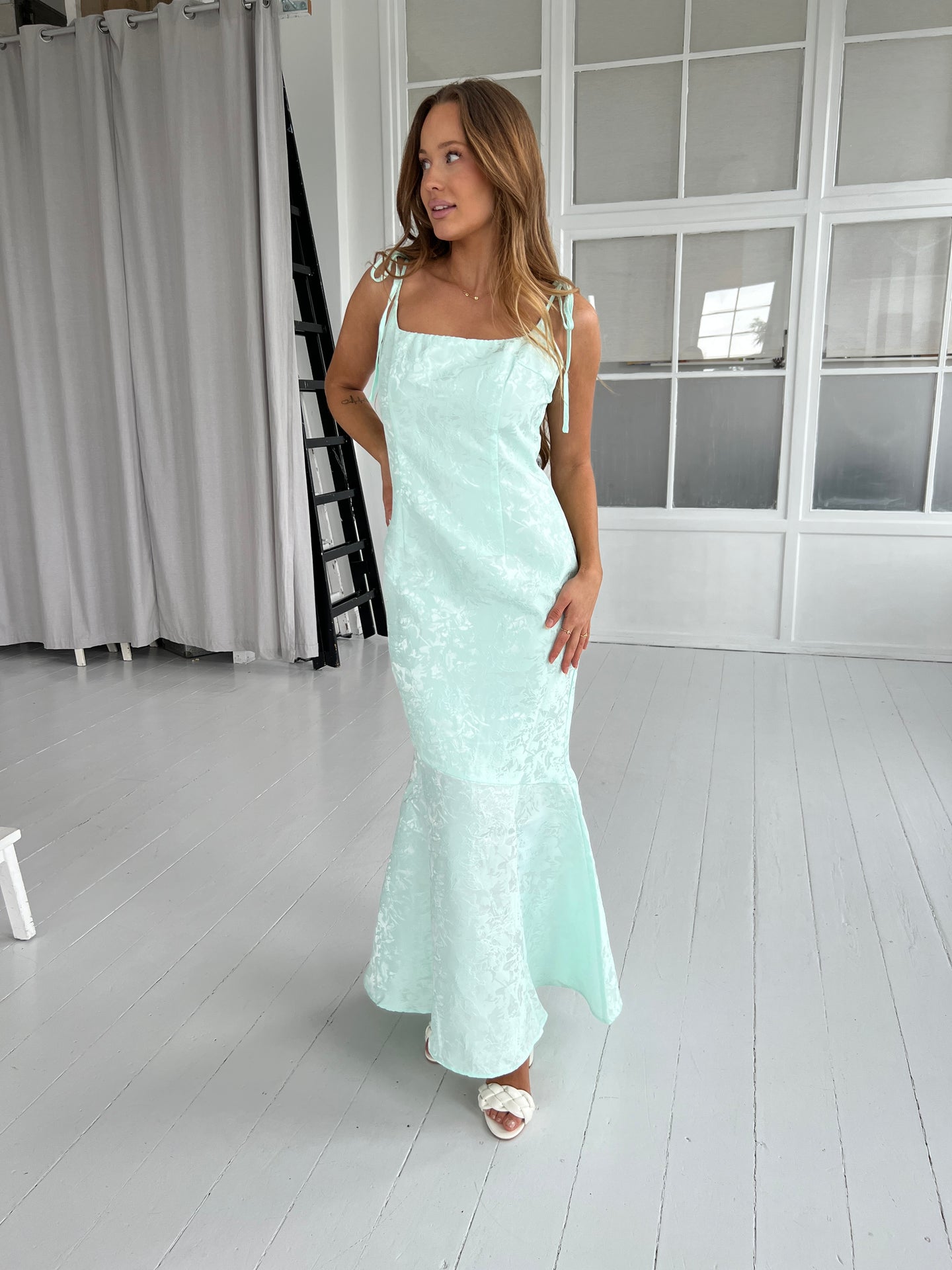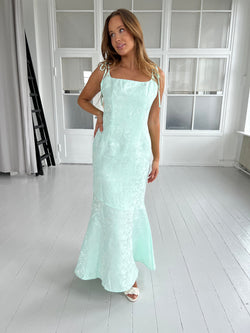 Beskrivelse: Virkelig smuk havfrue kjole med lynlås på ryggen. Underkjole og kan binde stropperne på skuldrene så de passer til en. Meget lækker kvalitet satin med et fint blomsterprint i samme farve. Blød og behagelig at have på.