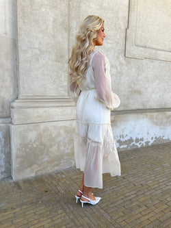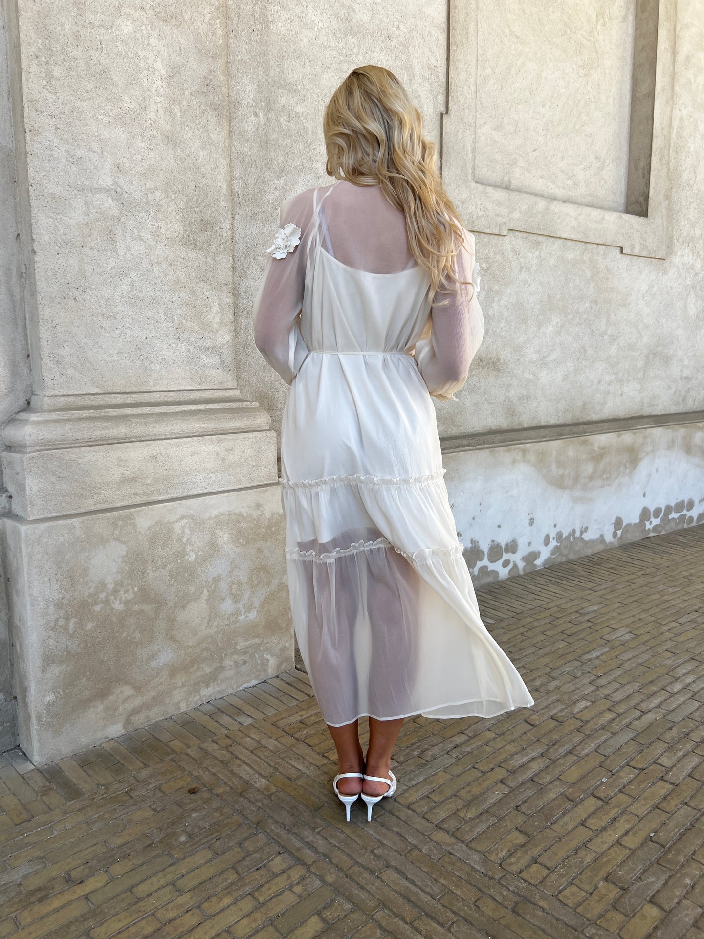 Virkelig smuk lang kjole med knælang underkjole m. stropper og yderkjole i chiffon med V-udskæring, bindebånd til taljen og mange fine detaljer - lettere oversize i str.