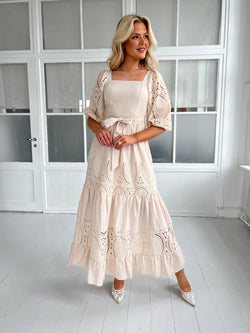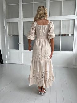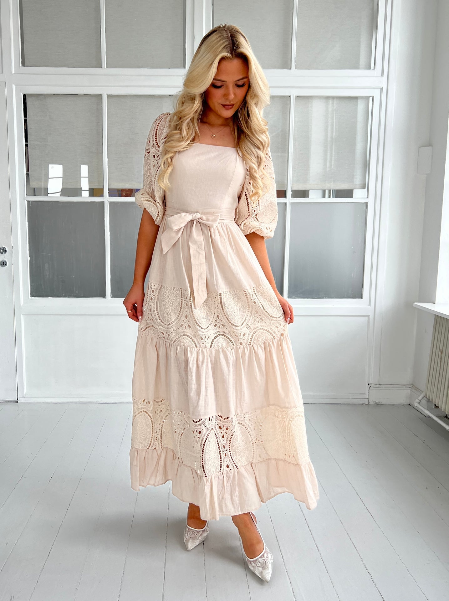 Beskrivelse: En romantisk beige boheme maxikjole med blonde detaljer på hele kjolen. I bunden er der en smuk flæse som afslutter kjolen. Den har 3/4 blonde ærmer og er perfekt til sommer og særlige anledninger. Lukkes med lynlås på ryggen. underkjole til knæet. Bindebånd. firkantet halsudskæring