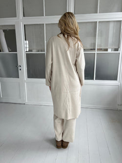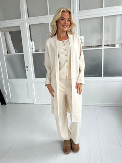 Et virkelig smukt sæt fra flam, sættet kommer med et par løse strik bukser med elastik i livet, og en sød strik vest med rund hals og gyldne knapper, samt en lang cardigan. Super lækkert sæt, hvor man sagtens kan bruge delene hver for sig.