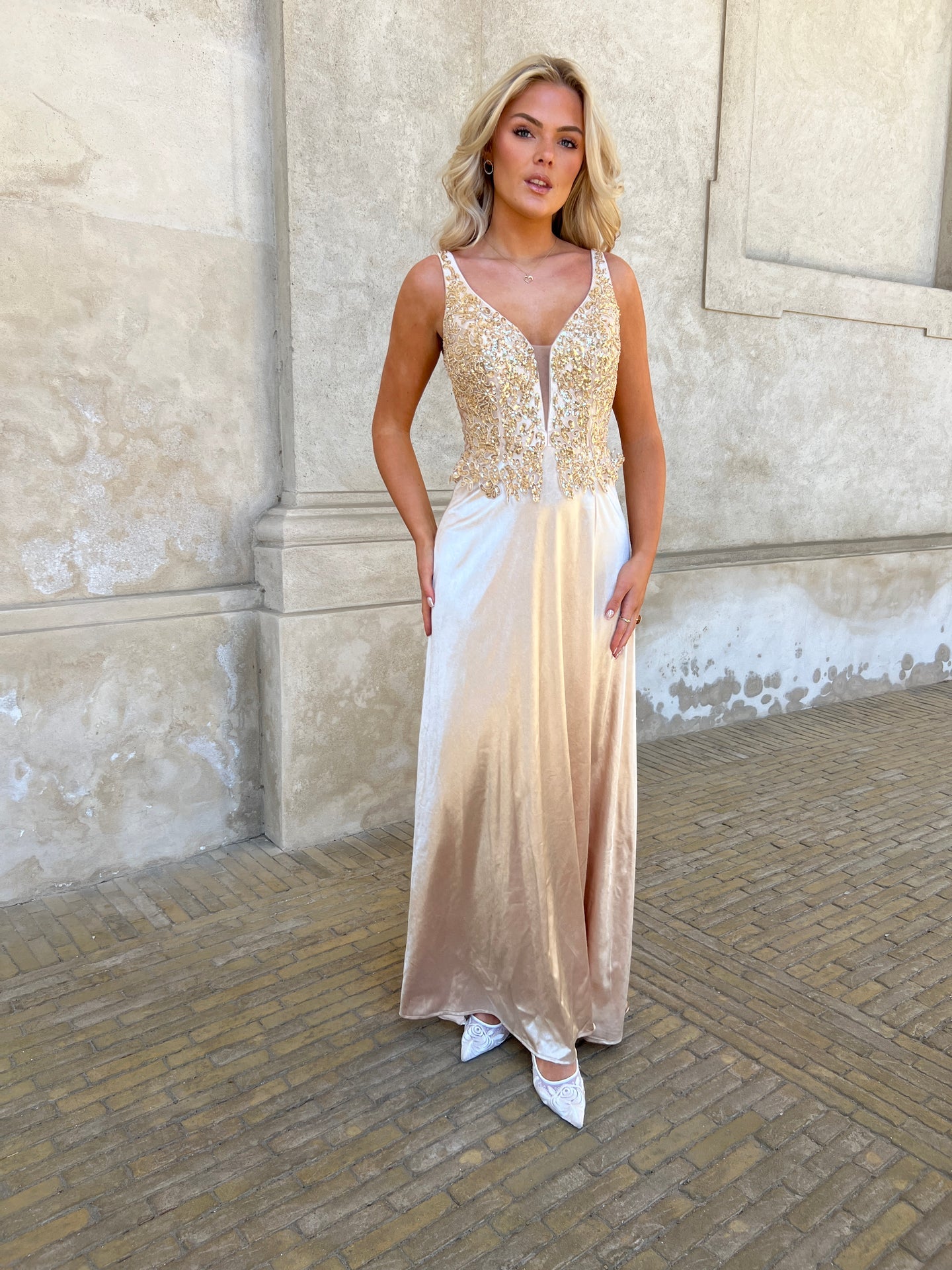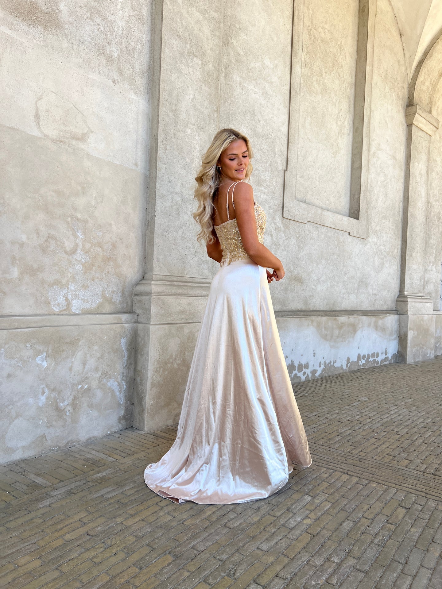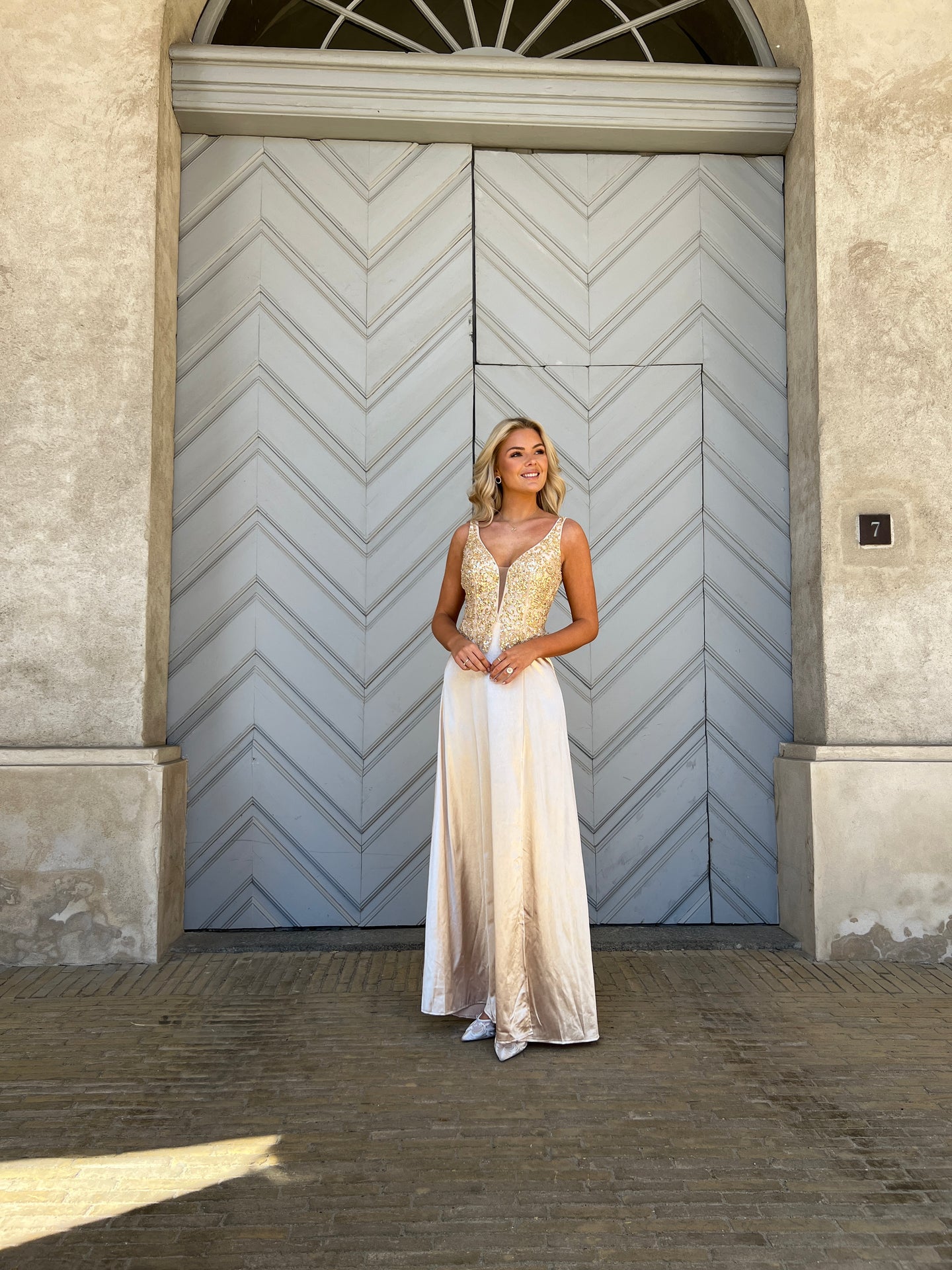 Beskrivelse: Virkelig smuk champagne farvet lang cocktail kjole i shiny satin med gyldne pailletter - justerbare stropper. Pudder i toppen ved bryst. lækker kvalitet, ikke gennemsigtig. Slids, der er slæb på kjolen som er ca 170-175 cm i længden, lynes på ryggen
