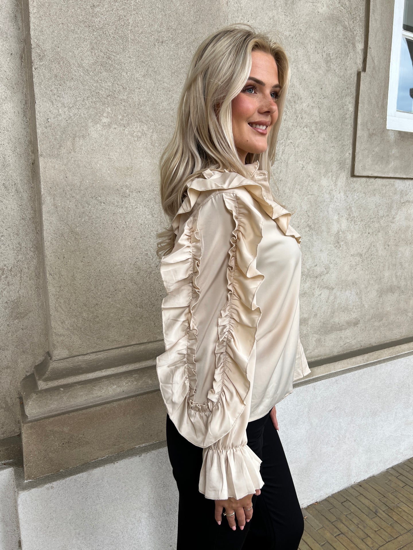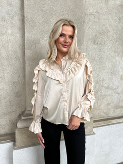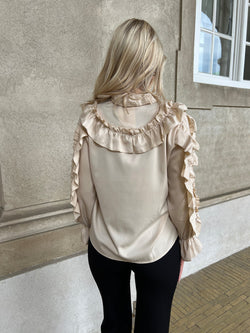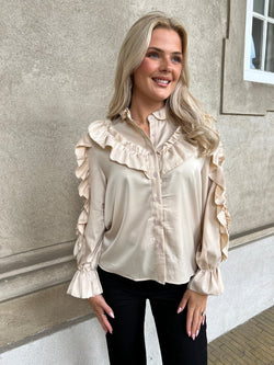 Virkelig smuk og feminin skjorte bluse med masser af flæser og fine detaljer. Lækker champagne farve