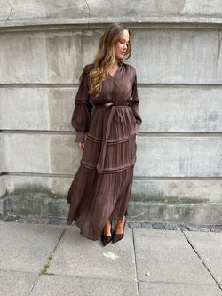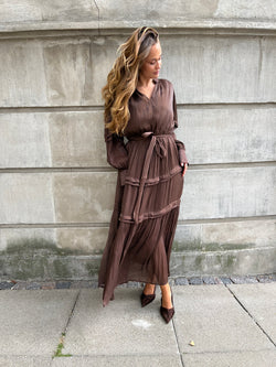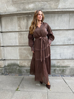 Meget smuk chokolade brun kjole i shiny satin, med mange fine detaljer. V-udskæring, bindebånd, elastik i livet. Lange ærmer. Underkjole