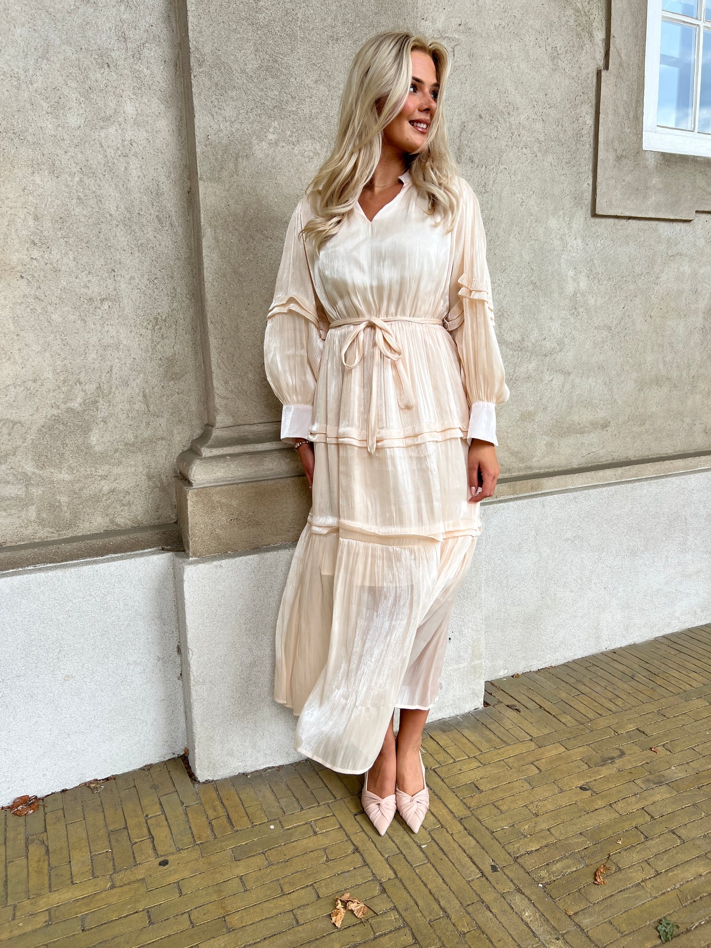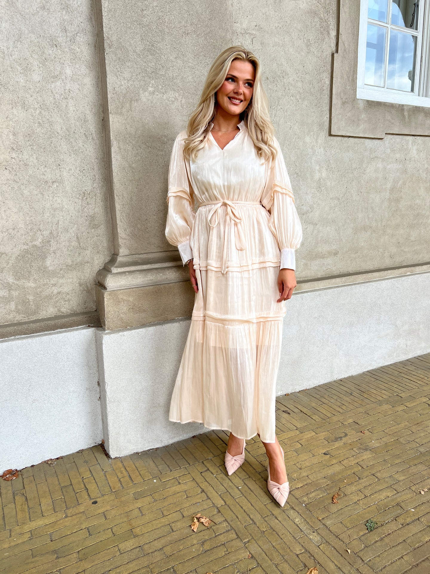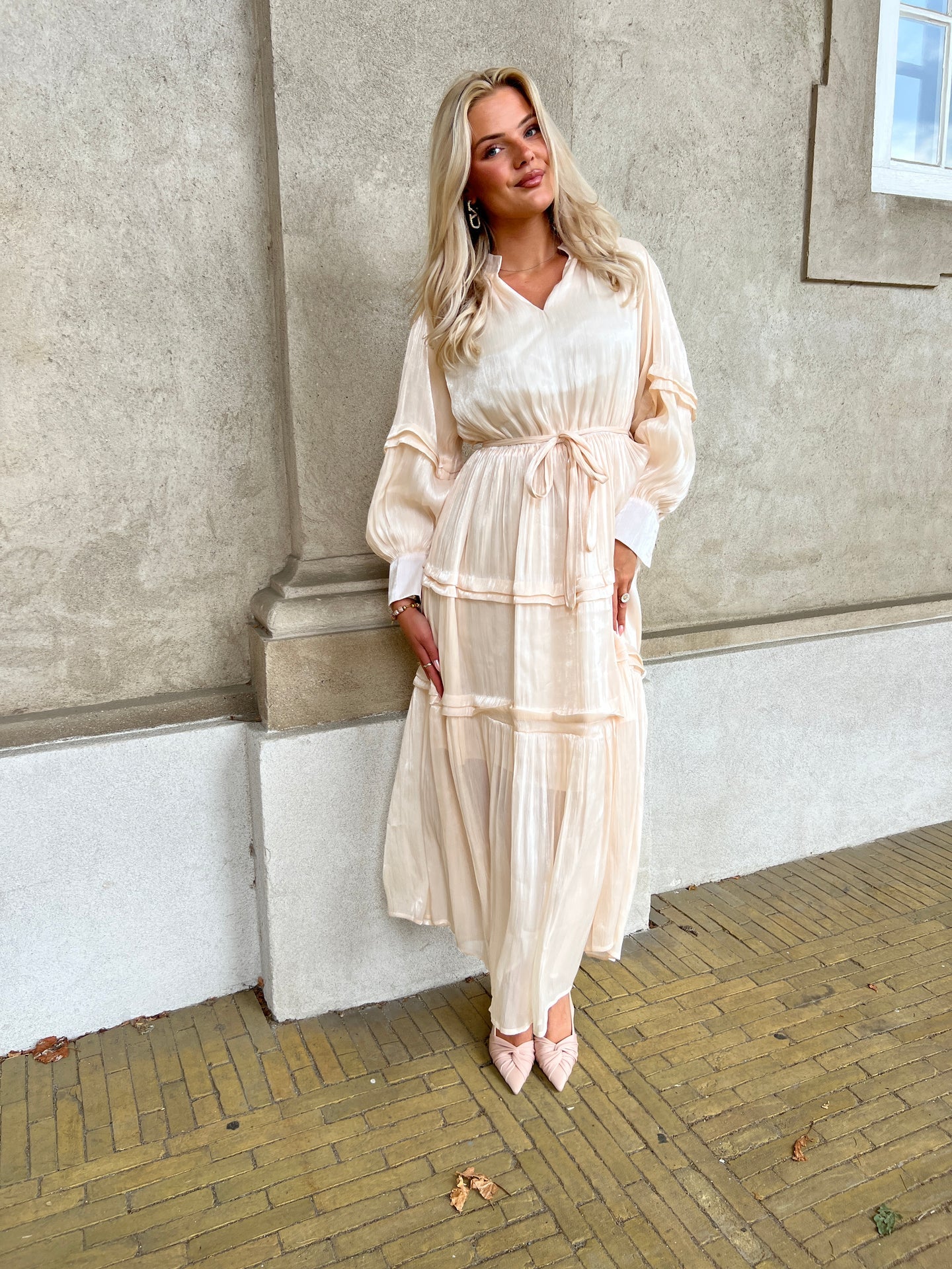 Meget smuk beige kjole i shiny satin, med mange fine detaljer. V-udskæring, bindebånd, elastik i livet. Lange ærmer. Underkjole