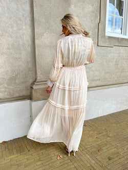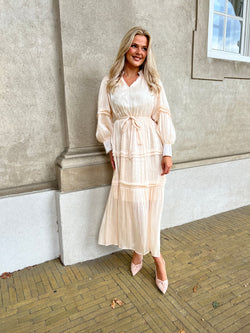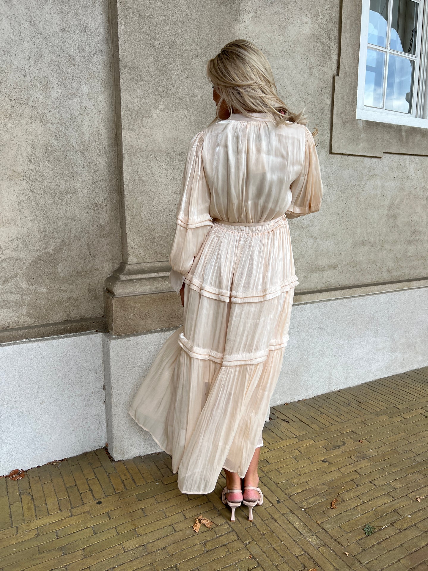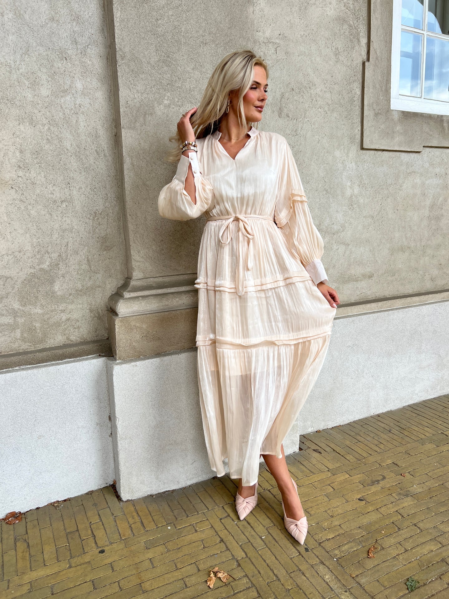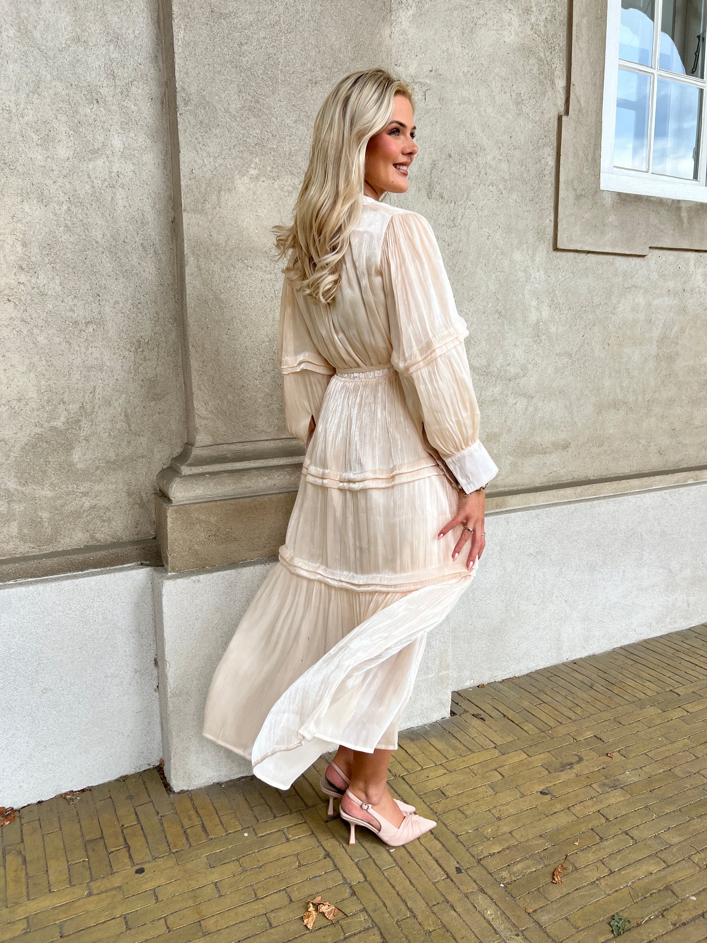 Meget smuk beige kjole i shiny satin, med mange fine detaljer. V-udskæring, bindebånd, elastik i livet. Lange ærmer. Underkjole