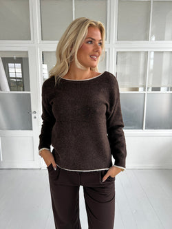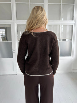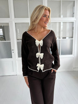 Super lækker og blød strik i flot mørkebrun fare. Strikken har cremefarvede detaljer ved halsudskæringen og søde pynte sløjfer. Stikken kan ikke åbnes og sløjferne er kun til pynt. Den har ribkant på ærmerne og dyb V-udskæring. Normal i str. Der er lidt stræk i materialet.