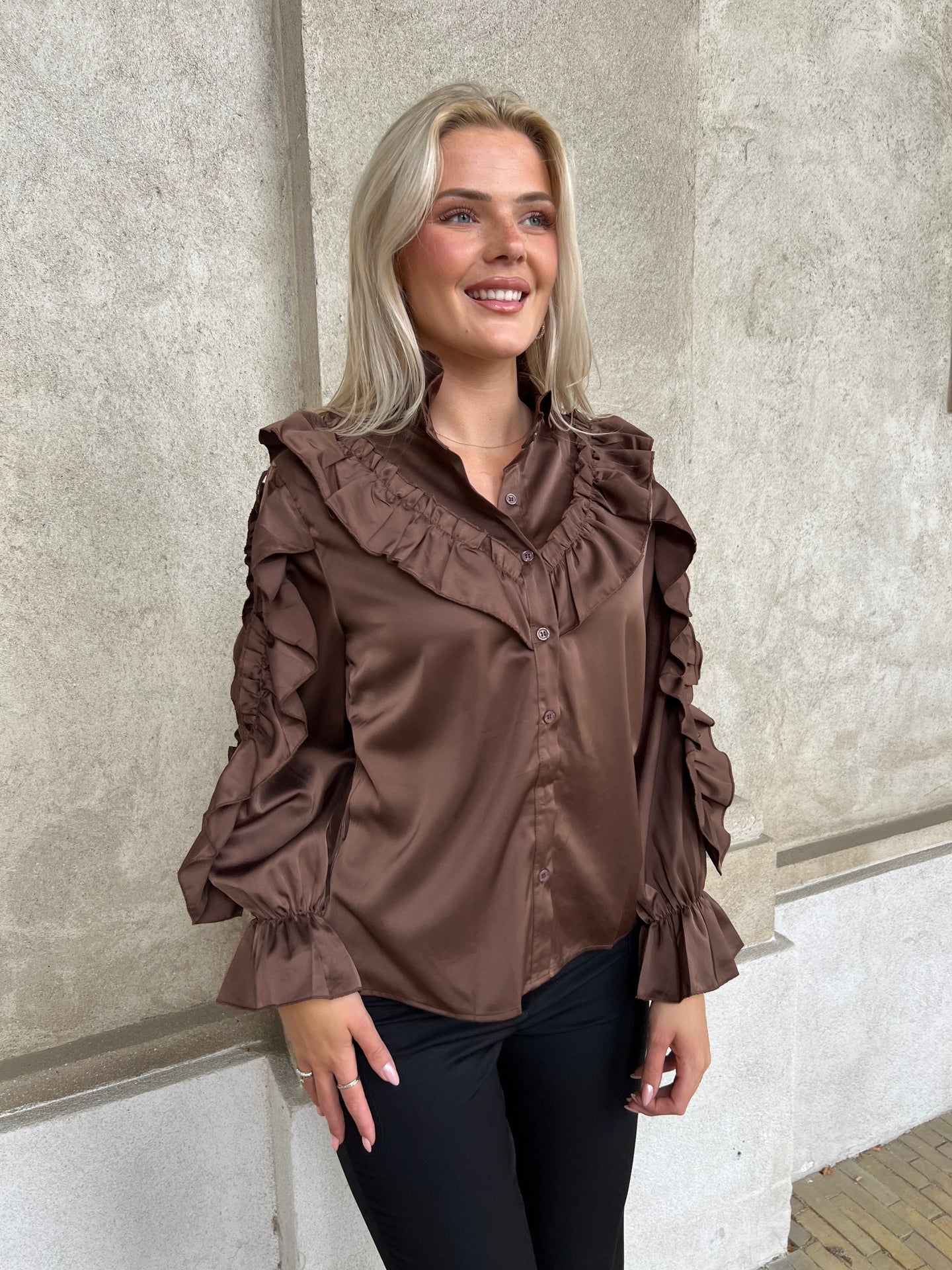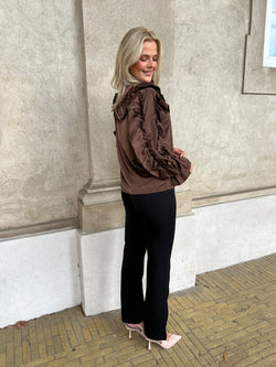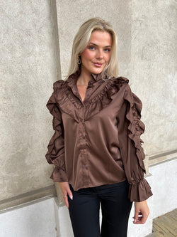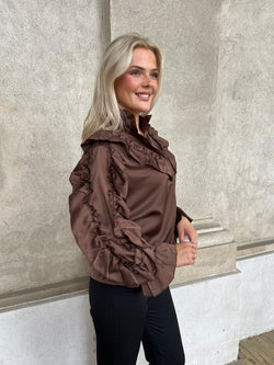 Virkelig smuk og feminin skjorte bluse med masser af flæser og fine detaljer. Lækker mørkebrun farve