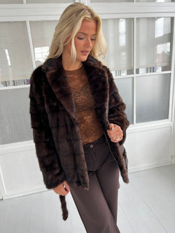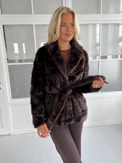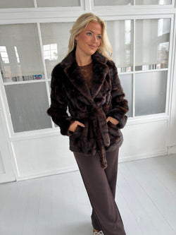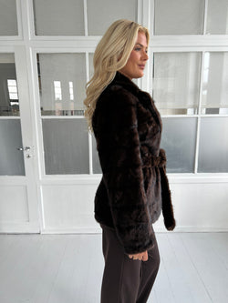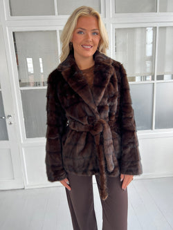 Meget smuk fake fur jakke med bindebånd og krave, lidt minkagtig i pelsen. V-udskæring og satin foer. Virkelig smuk, blød og varm til de kolde dage