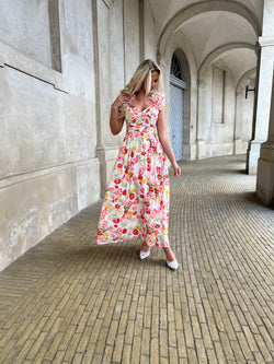Beskrivelse: En meget smuk maxikjole i et meget smukt blomsterprint.. . Mange søde detaljer som gør kjolen unik og perfekt til sommerens fester og særlige anledninger. Åbning på ryggen, hvor kjolen bindes. Der er elastikbånd på ryggen som gør der er god plads i den og den sætter sig pænt. Slids og underkjole.