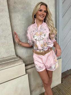 Et virkelig smukt sæt, sættet kommer med shorts, inderstof, lommer, lynes på ryggen., og en virkelig sød bluse med masser af smukke detaljer til. Det er i den smukkeste gule pastel farve med et smukt blomsterprint. knappes foran, korte ærmer med elastik og pufærmer.