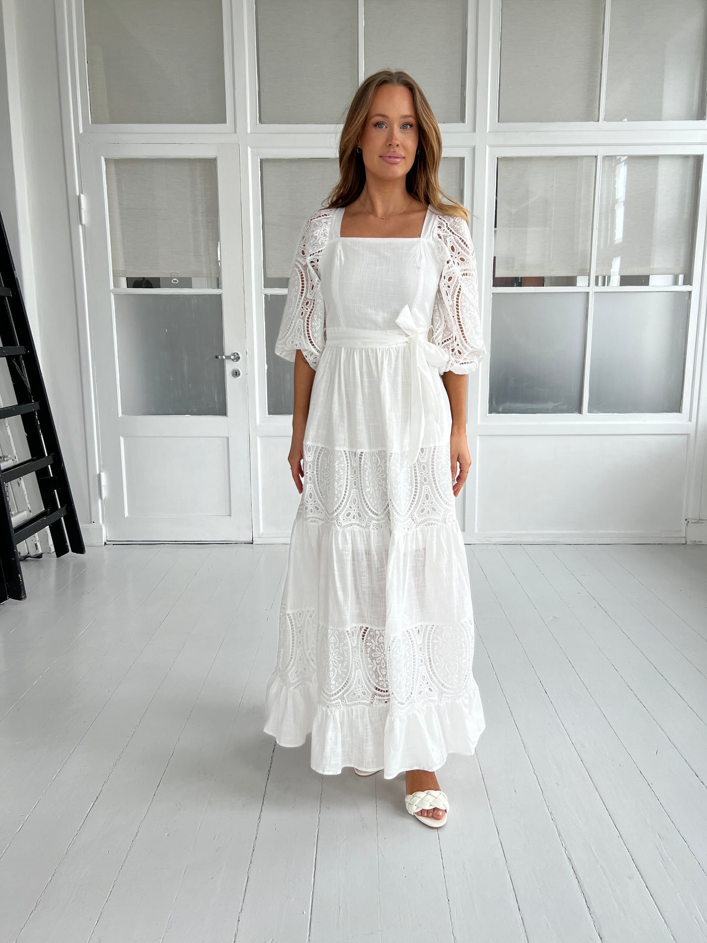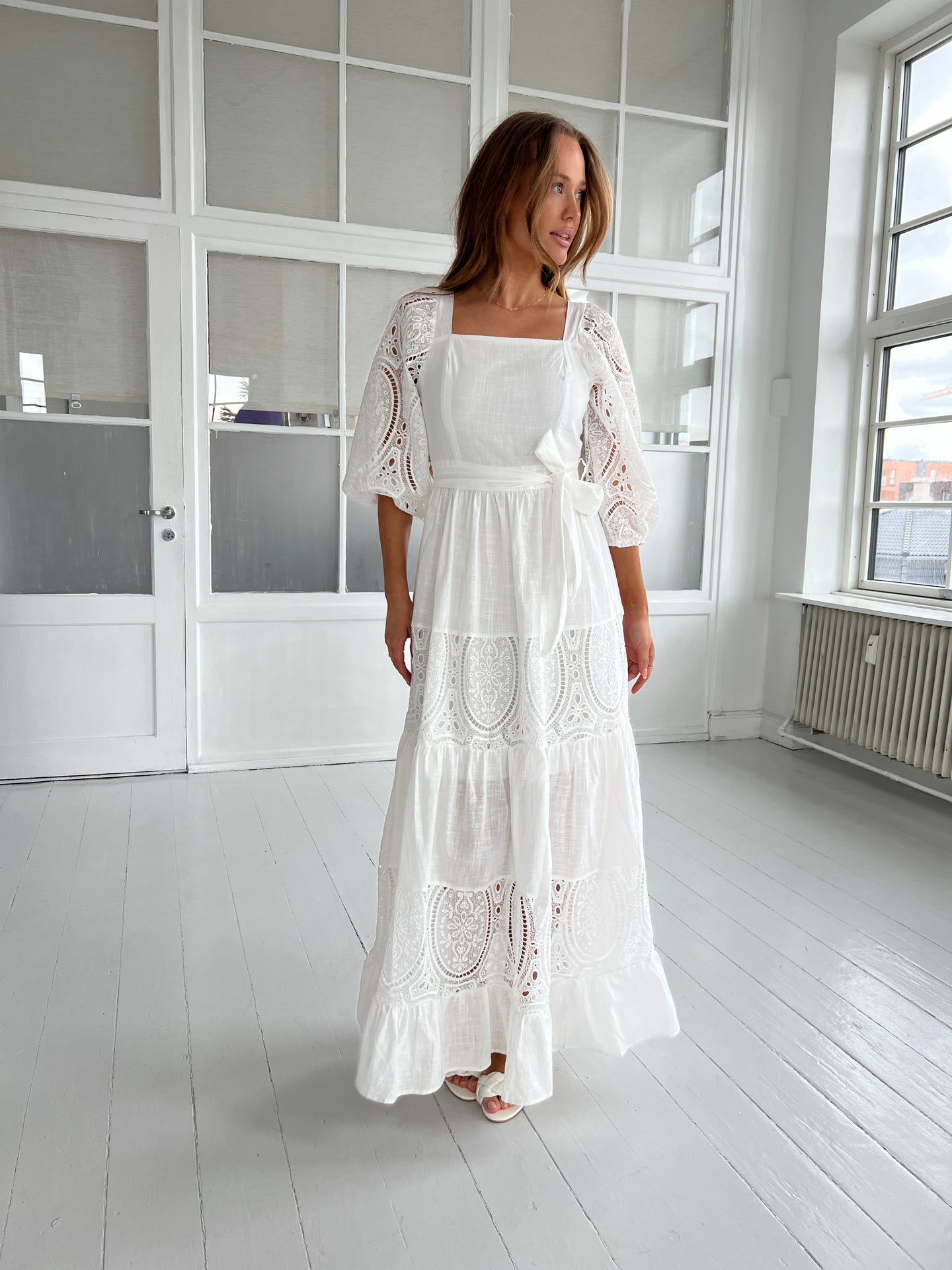 Beskrivelse: En romantisk hvid boheme maxikjole med blonde detaljer på hele kjolen. I bunden er der en smuk flæse som afslutter kjolen. Den har 3/4 blonde ærmer og er perfekt til sommer og særlige anledninger. Lukkes med lynlås på ryggen. underkjole til knæet. Bindebånd. firkantet halsudskæring