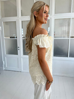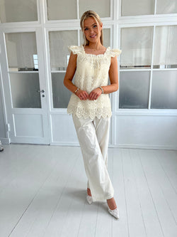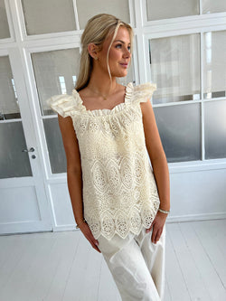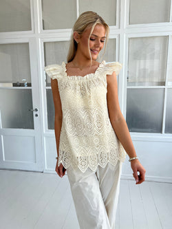 Beskrivelse: Let a-skåret med firkantet halsudskæring, brede skuldre og stropper med flæsedetaljer i bomuld. Toppen er i det fineste blonde materiale og har understof.