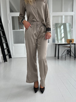 Super smukke satin bukser med lige ben. Bukserne har elastik, snører i livet og lommer. Bukserne kommer i størrelse S/M & L/XL. Lækker blød satin kvalitet som krøller meget lidt