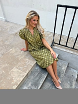 Her får du den fineste kaftan, i efterårets musthave. Kjolen er med knapper foran i den smukkeste guld farve. Korte ærmer med elastik og lille puf. lommer på begge sider. Dette er en oversize model og skal sidde løst. Stor påsyet guldsmed på ryggen
