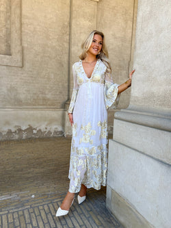 Utrolig smuk kjole med flotte perle detaljer og en elegant v-udskræing. Kjolen har løse 3/4 ærmer og elastik i livet. Der er påsyet perler og pailletter og sten på kjolen.