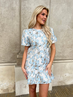 Beskrivelse: Virkelig smuk og feminin jaquard lige kjole med ruffle flæse forneden og pufærmer. Rund hals, går til lige over knæet. Normale i str.