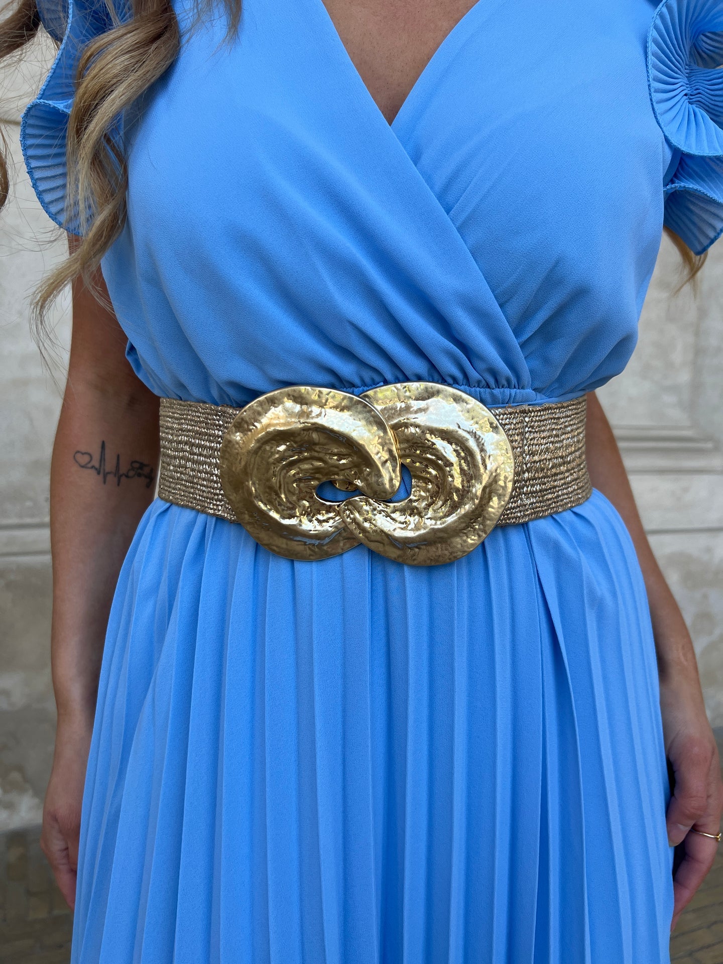 Et elastisk stråbælte med et gyldent dobbeltspænde, der fremhæver taljen og løfter ethvert outfit med et stilfuldt touch.