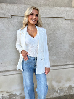 Beskrivelse: Denne elegante hvide blazer har en flot, tekstureret finish med dekorative smukke knapper Den har en klassisk pasform, V hals, skulderpuder og to frontlommer, der giver et eksklusivt touch. Den lukkes med knapper foran.