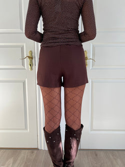 Shorts bliver et musthave dette efterår/vinter. Smukke mørkebrune shorts med elastik på ryggen og lukkes med knap og lynlås foran. Der medfølger bælte med en fin gylden søstjerne. Lommer i siderne, læg foran.