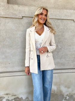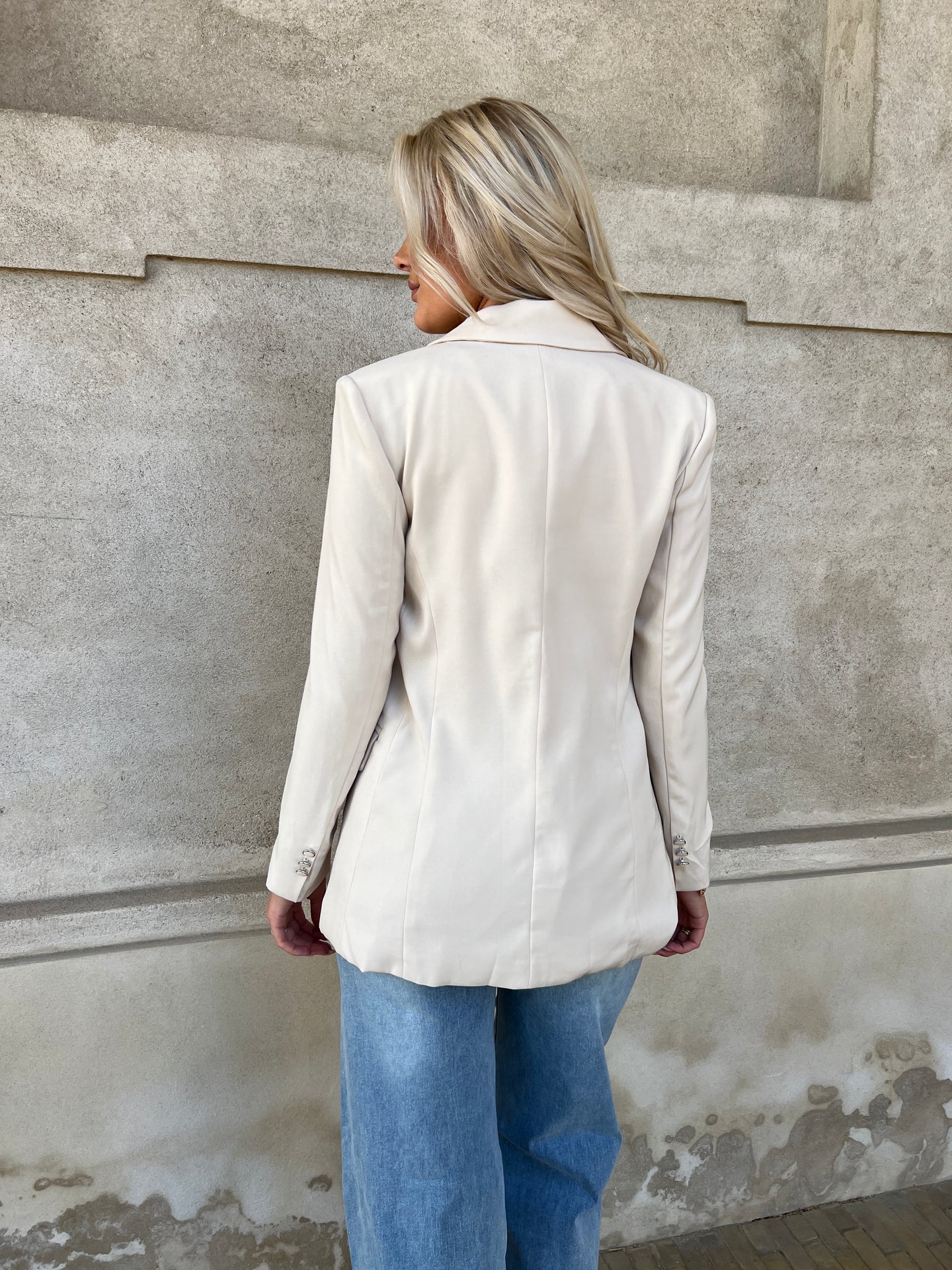 Beskrivelse: Denne elegante beige blazer har en flot, tekstureret finish med dekorative smukke knapper Den har en klassisk pasform, V hals, skulderpuder og to frontlommer, der giver et eksklusivt touch. Den lukkes med knapper foran.
